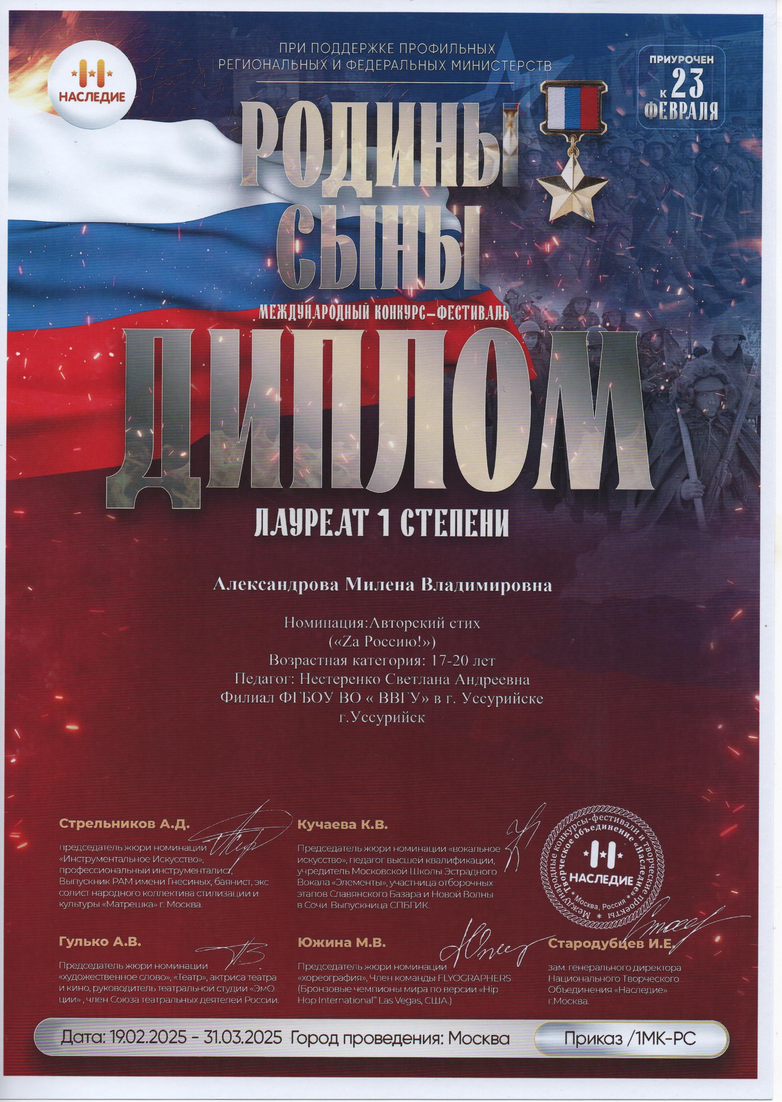 "РОДИНЫ СЫНЫ" | конкурс-фестиваль | Международный | 19.02.2025 - 31.03.2025 | Лауреат 1 степени |