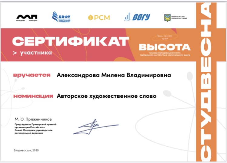 | краевой молодежный конкурс "Высота" СТУДВЕСНА | театральное мастерство | Городской, краевой | 04.04.2025 - 05.04.2025 | Участник |