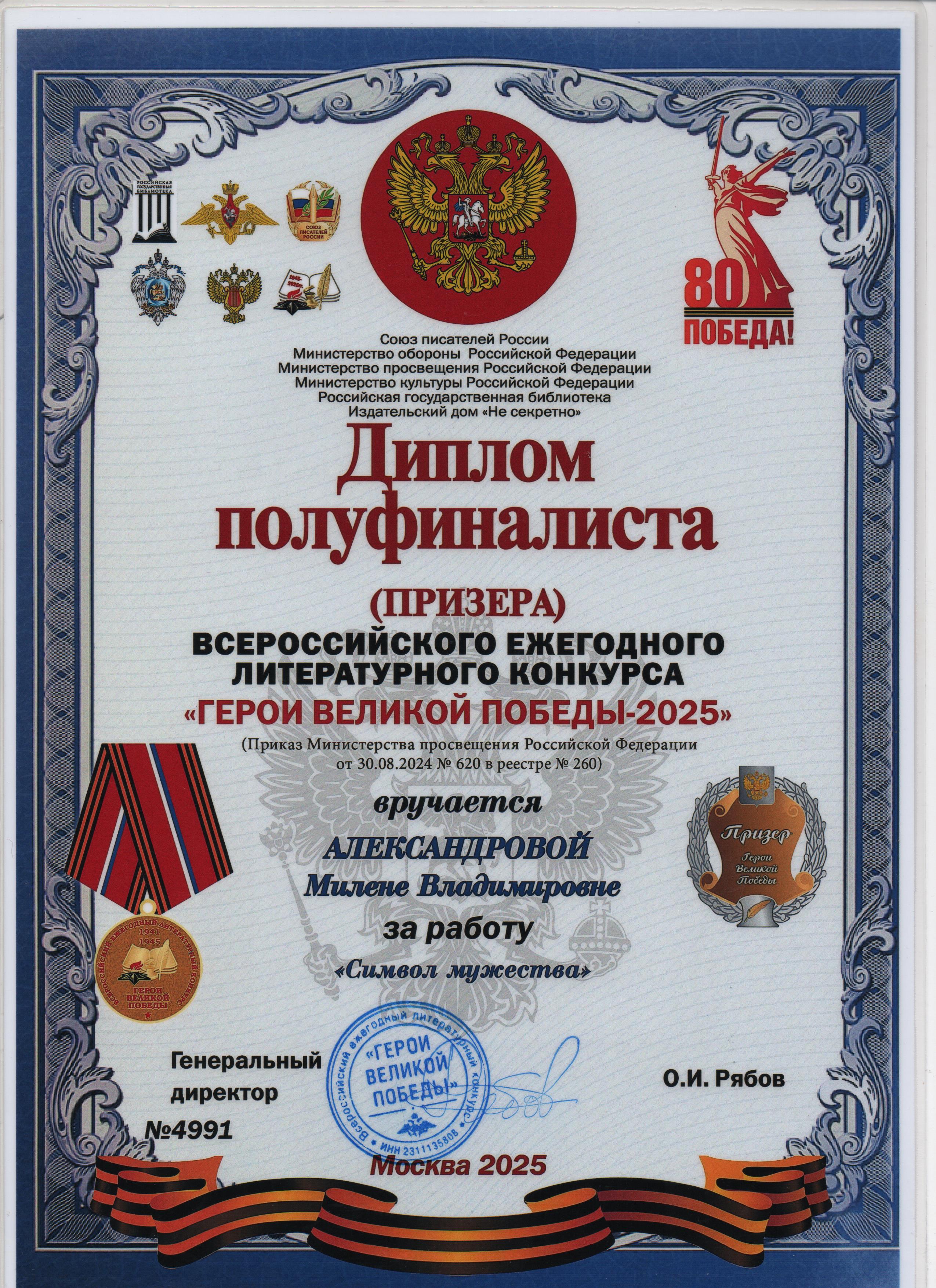| ежегодный литературный конкурс "ГЕРОИ ВЕЛИКОЙ ПОБЕДЫ 2025" | патриотический | Всероссийский | 20.03.2025 - 20.07.2025 | полуфиналист(призер) |