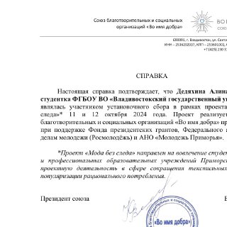 Участие в установочном сборе в рамках проекта "Мода без следа", проектная деятельность в сфере рационального потребления | Стратегическая сессия | Городской, краевой | 11.10.2024 - 12.10.2025 | Участник |