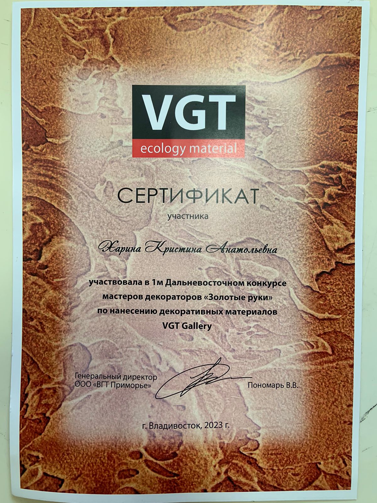 Дальневосточный конкурс мастеров декораторов "Золотые руки" по нанесению декоративных материалов VGT Gallery | Всероссийский | 01.02.2023 - 28.02.2023 | Участник |