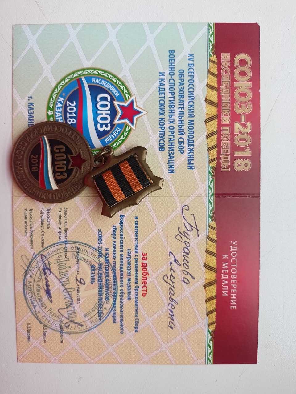 | Всероссийский молодёжный образовательный сбор военно-спортивных организаций и кадетских корпусов «СОЮЗ-2018 – Наследники Победы» | Всероссийский | 25.04.2018 | Победитель |