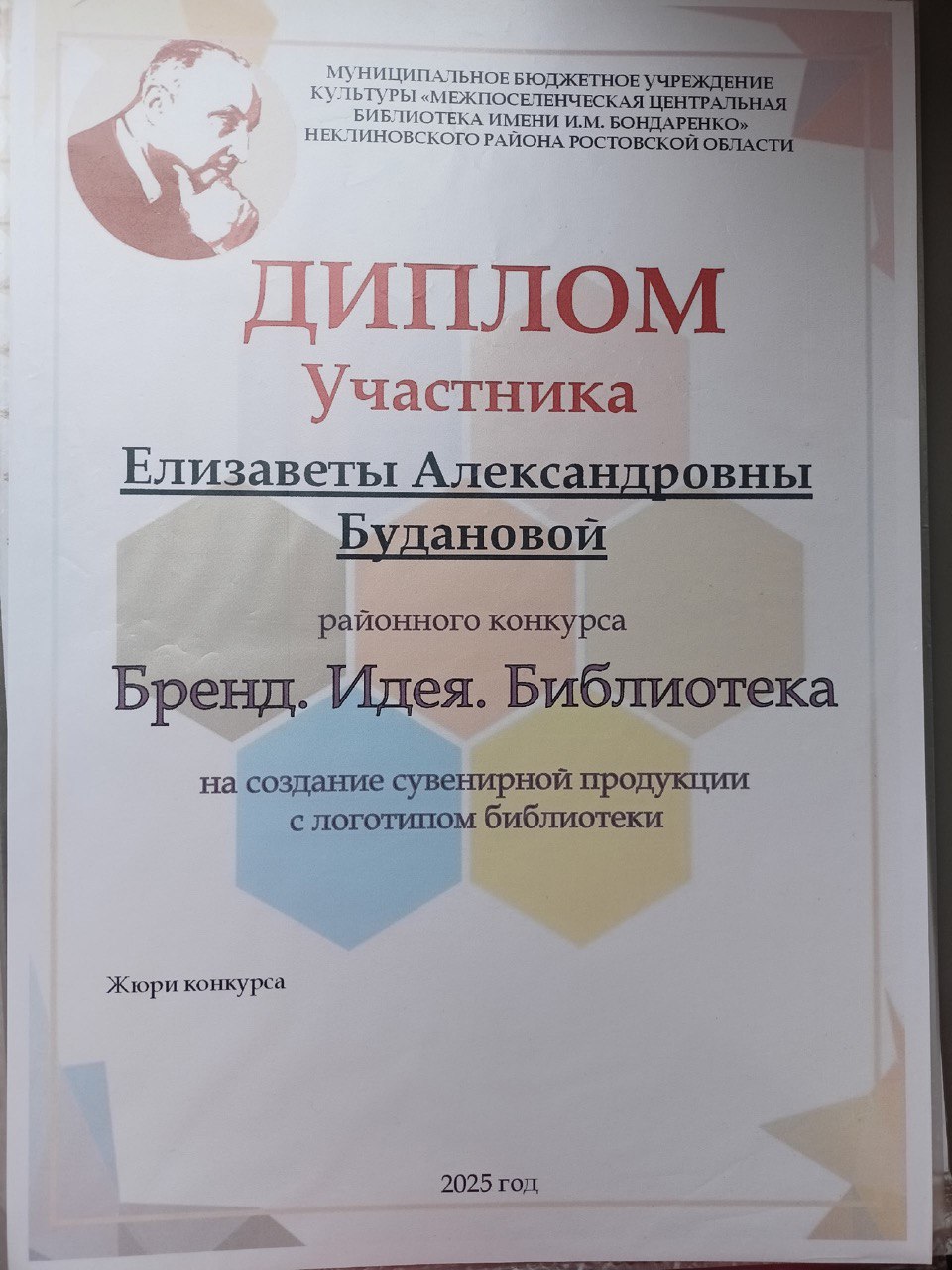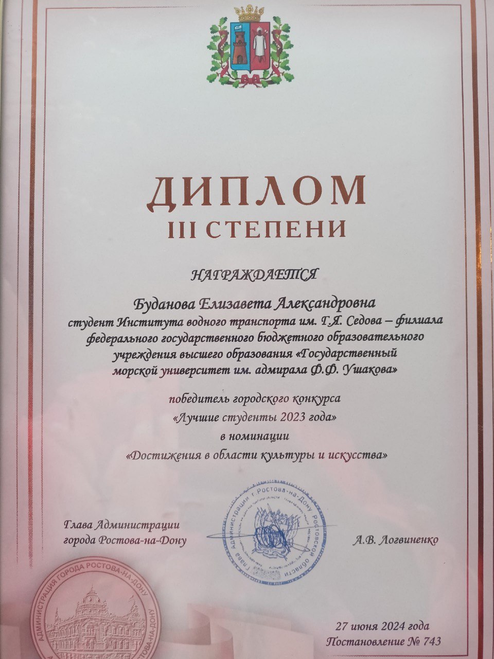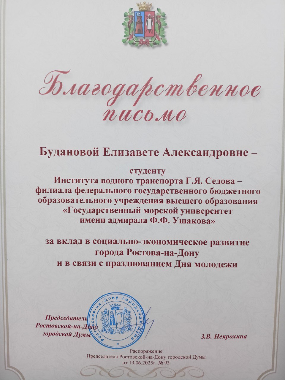 | Благодарственное письмо от председателя городской думы (Ростов на Дону) | Городской, краевой | 19.06.2025 | Победитель |