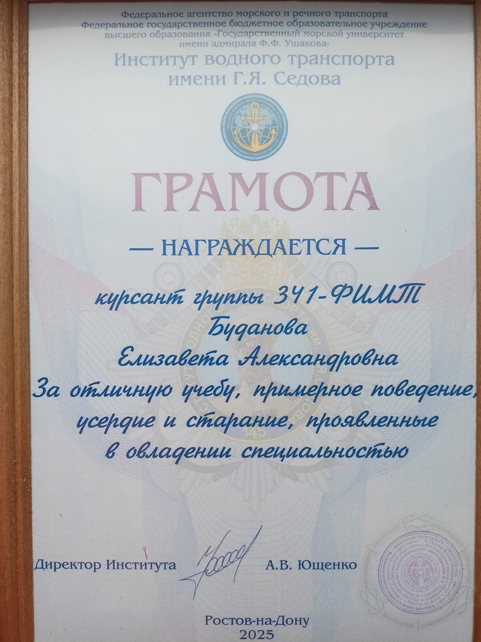 | За отличную учебу, примерное поведение, усердие и старание, проявленные в овладении специальностью | Внутривузовский | 01.06.2025 | Диплом |