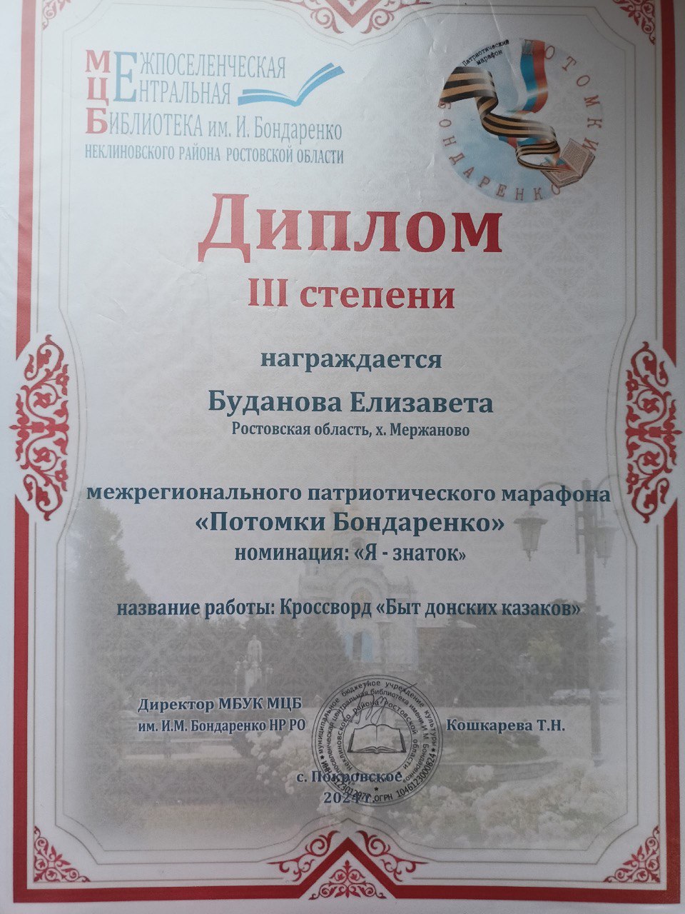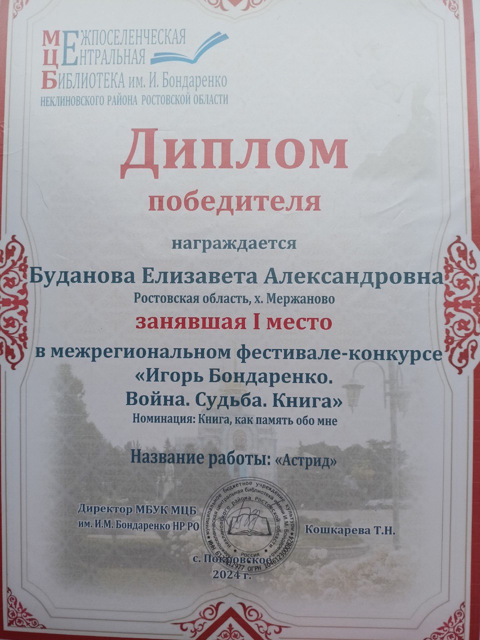 | Межрегиональный фестиваль-конкурс "Игорь Бондаренко.Война.Судьба.Книга" | Региональный | 09.09.2024 | 1 место или гран-при |