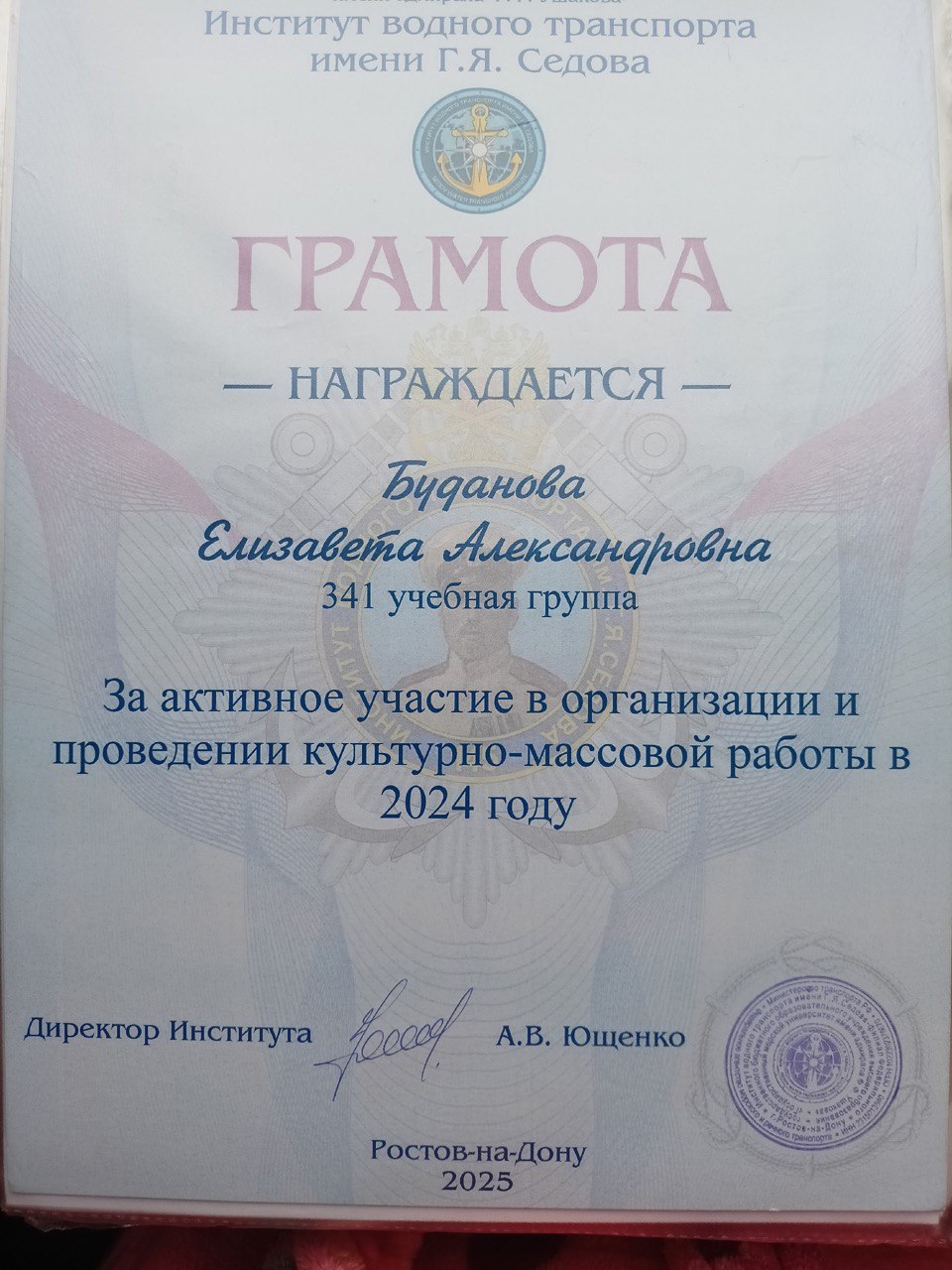 | За активное участие в организации и проведении культурно-массовой работы в институте | Внутривузовский | 02.03.2025 | Диплом |