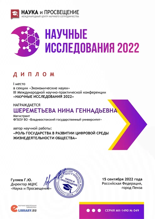 III Международная научно-практическая конференция «Научные исследования 2022» | Международный | 15.09.2022 - 15.09.2022 | Диплом |
