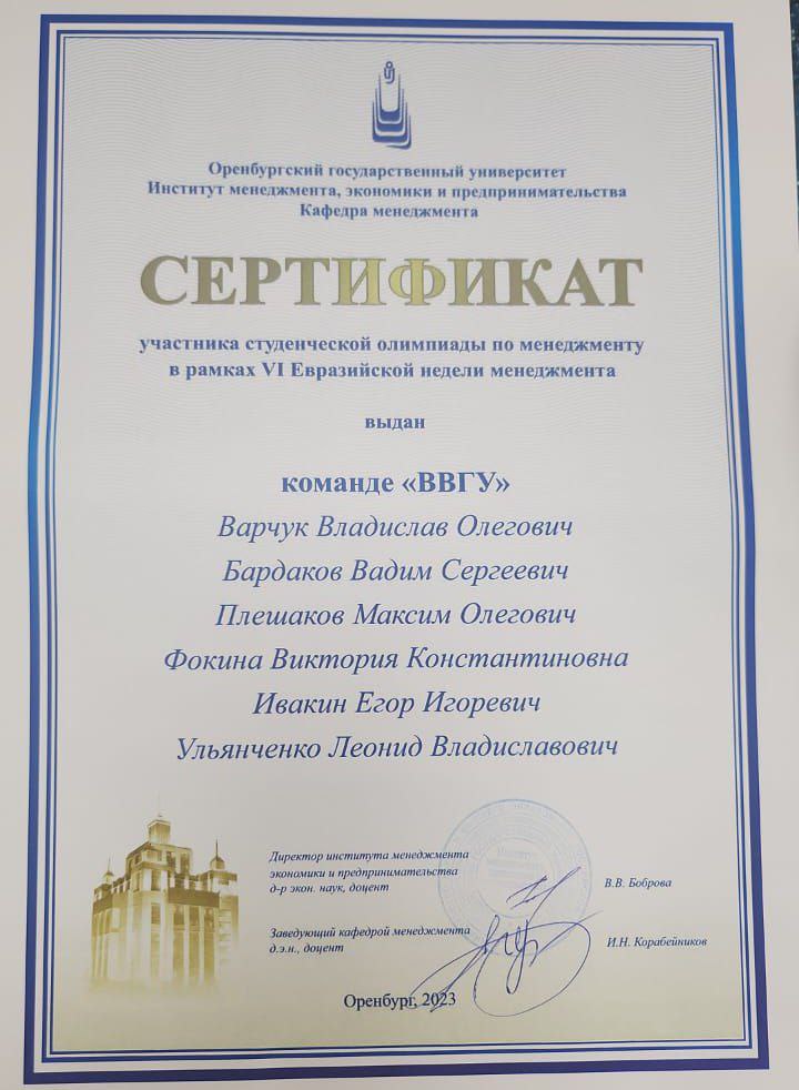 Студенческая олимпиада по менеджменту в рамках Евразийской недели менеджмента | Всероссийский | 01.09.2023 - 01.09.2023 | Участник |
