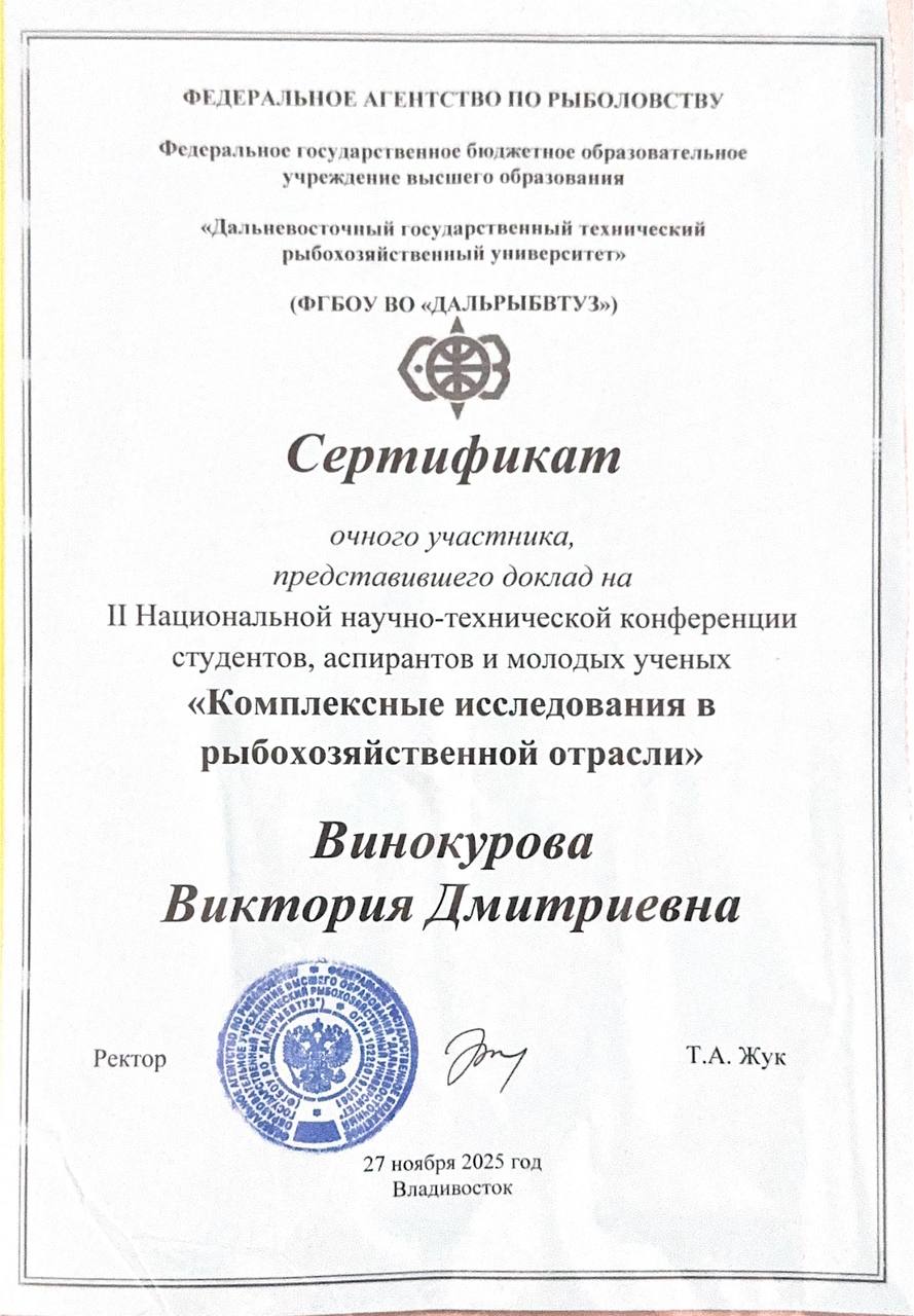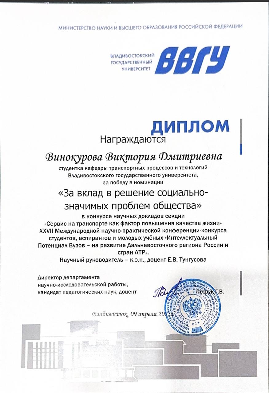 Интеллектуальный потенциал вузов – на развитие Дальневосточного региона России и стран АТР Внутривузовский 09.04.2025 Участник Диплом