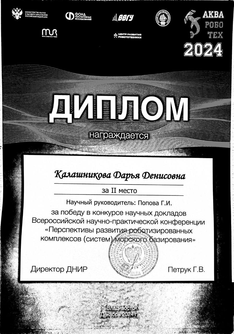 Всероссийская научно-практическая конференция "Перспективы развития роботизированных комплексов (систем) морского базирования" | Научно-практическая конференция | Всероссийский | 02.12.2024 - 12.12.2024 | 2 место |