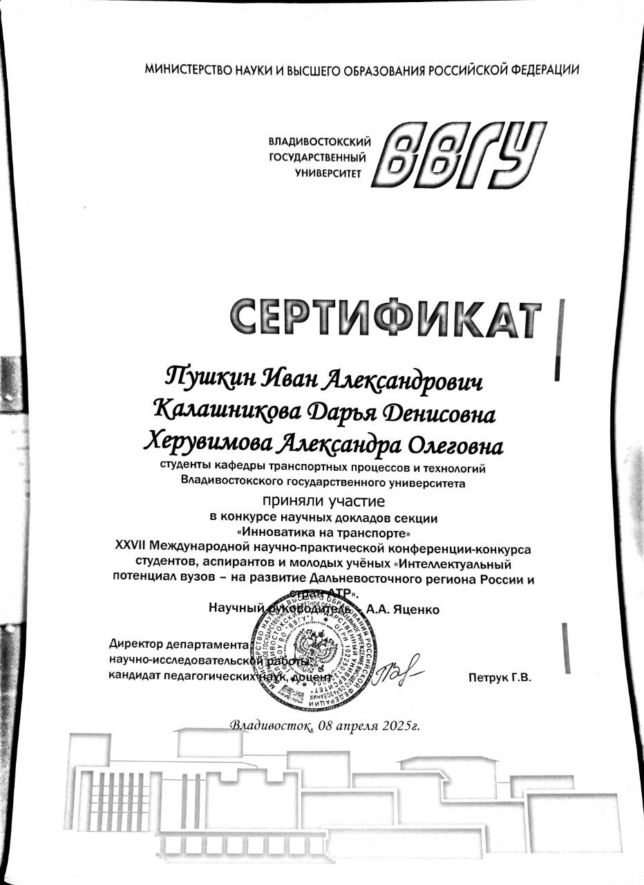 XXVII Международная научно-практическая конференция-конкурса студентов, аспирантов и молодых ученых "Интеллектуальный потенциал вузов - на развитие Дальневосточного региона России и стран АТР" | Научно-практическая конференция | Международный | 09.04.2025 - 11.04.2025 | Участник |