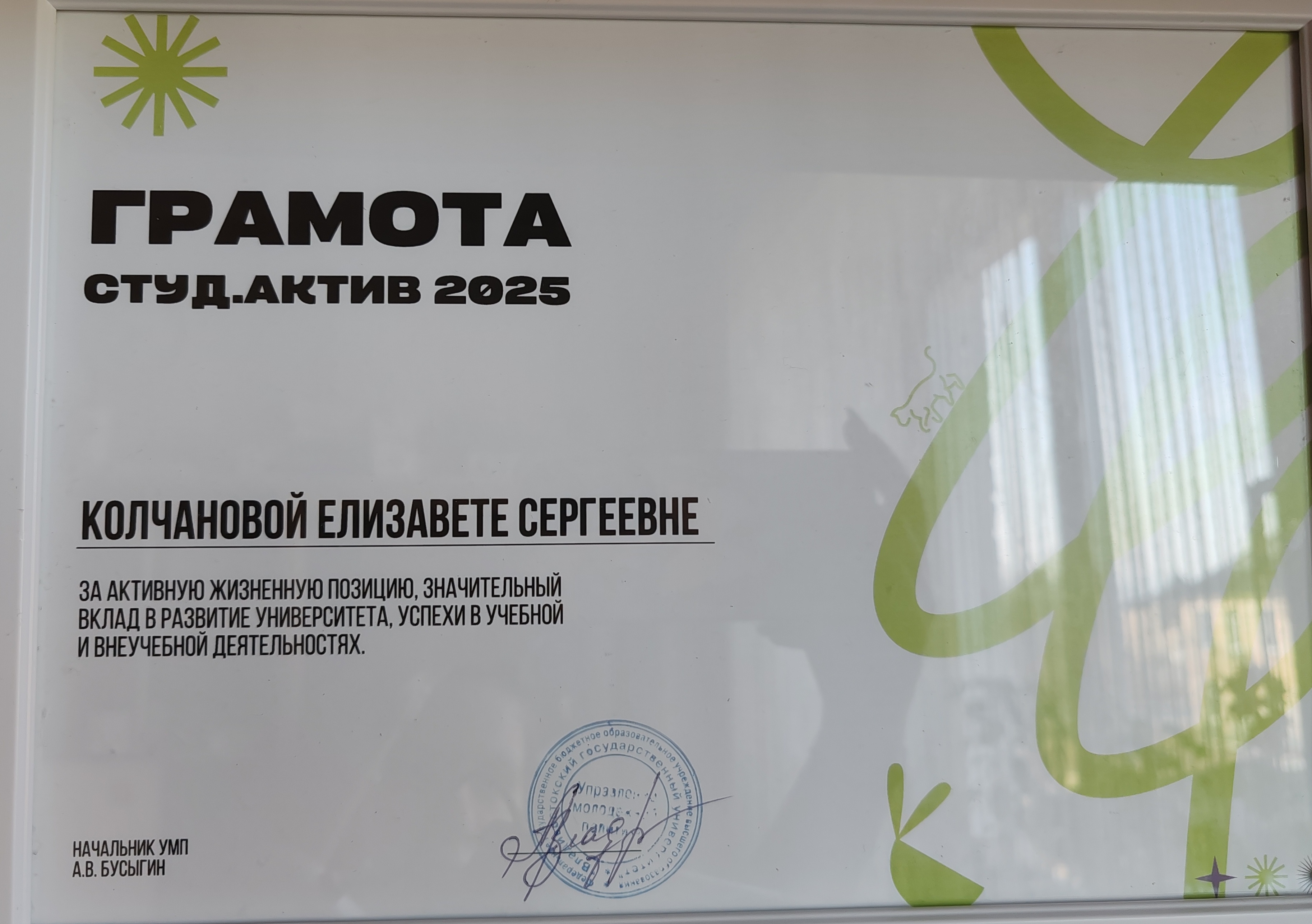 | Награждение за активную жизненную позицию, значительный вклад в развитие университета, успехи в учебной и внеучебной деятельности | Награждение | Внутривузовский | 18.07.2025 - 18.07.2025 | Грамота студ актив 2025 |