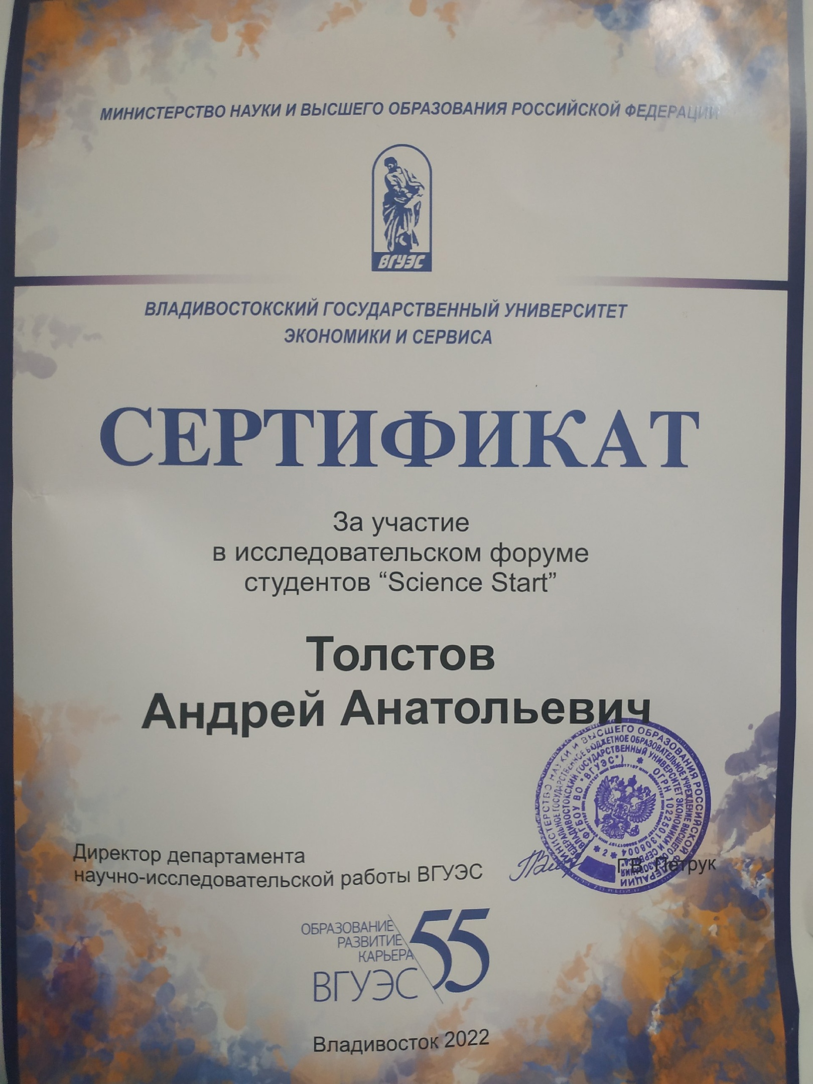 Science start Исследовательский форум Внутривузовский 15.06.2022 - 15.06.2022 Участник Диплом