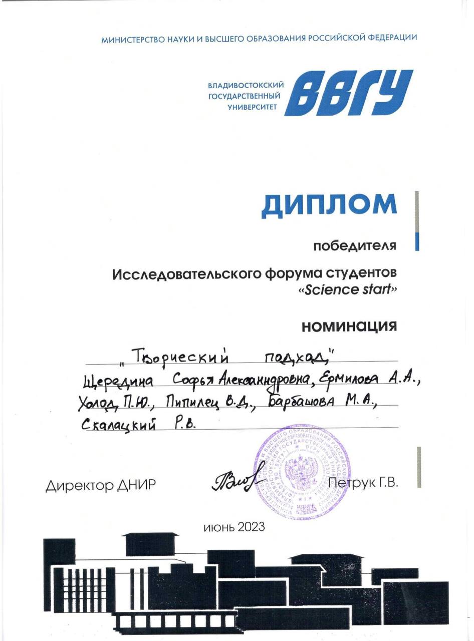 Исследовательский форум студентов "Science start" Внутривузовский 08.06.2023 - 08.06.2023 Участник Сертификат Гриванов Роман Игоревич
