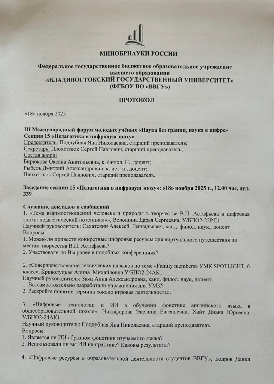 | 3 Международный форум молодых учёных | Научная конференция | Внутривузовский | 18.11.2025 - 18.11.2025 | Участник |