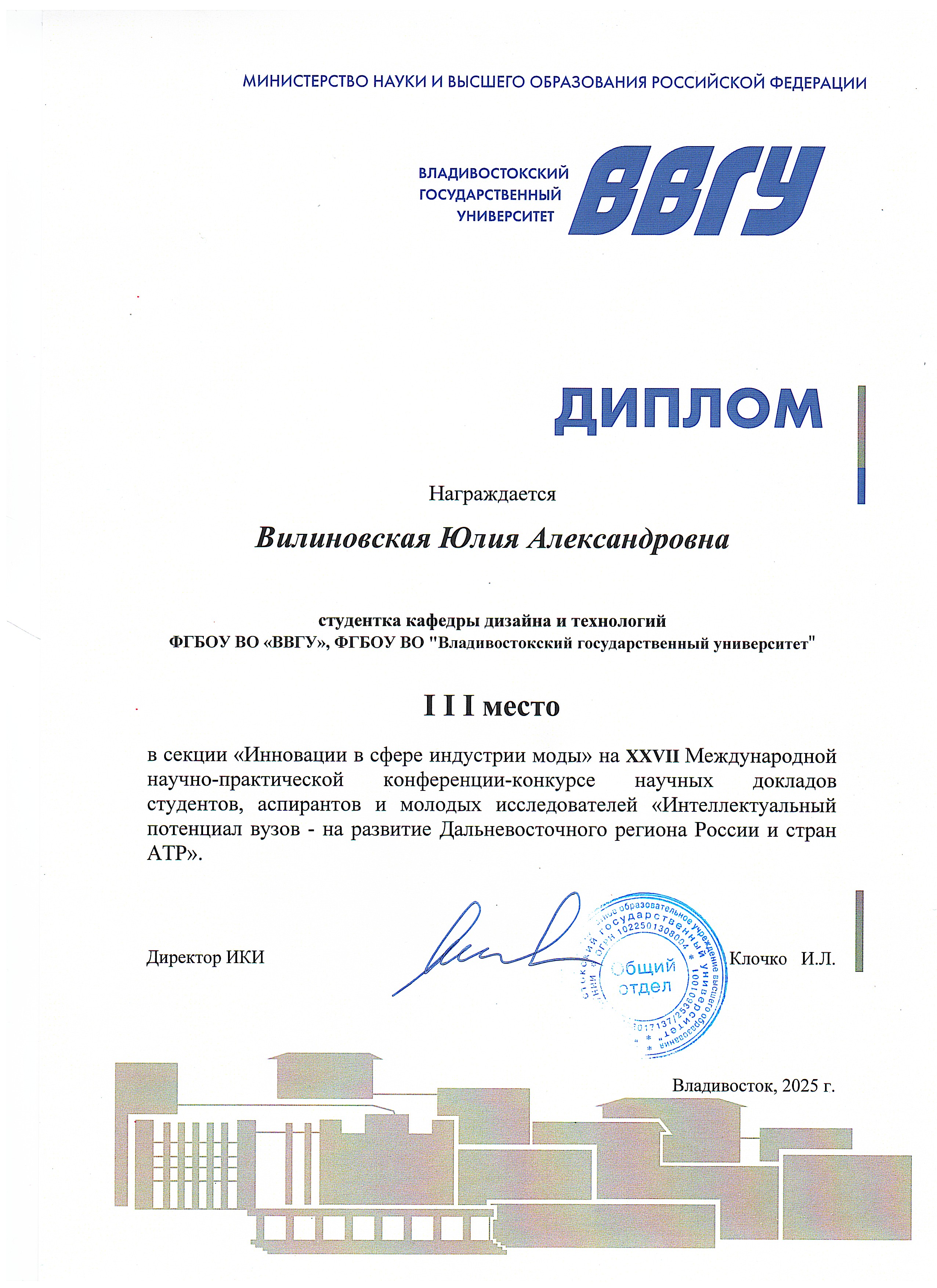 | XXVII Международная научно-практическая конференция-конкурс научных докладов студентов, аспирантов и молодых исследователей «Интеллектуальный потенциал вузов – на развитие Дальневосточного региона России и стран АТР» | Международный | 09.04.2025 - 11.04.2025 | 3 место |