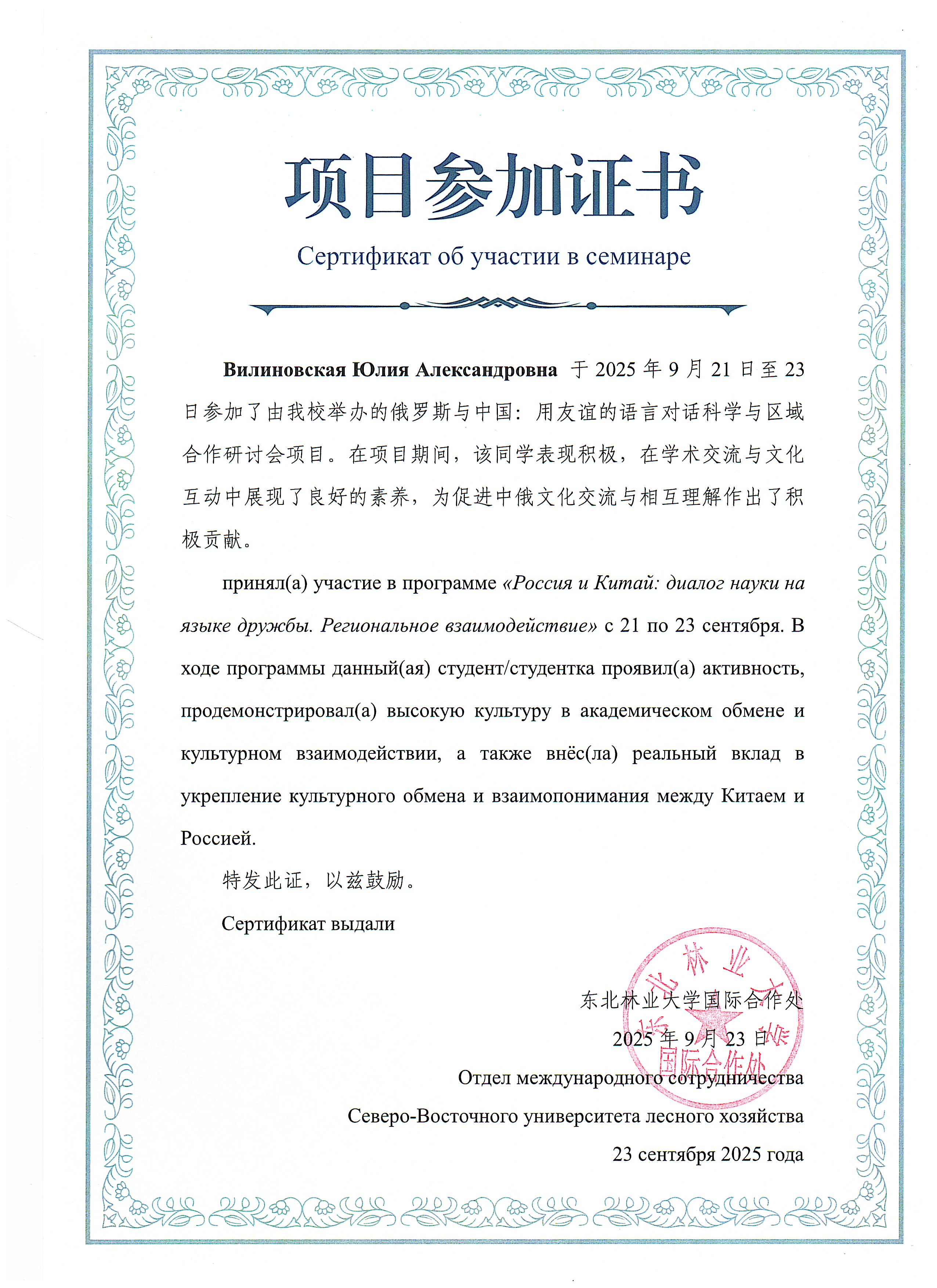 | «Россия и Китай: диалог науки на языке дружбы. Региональное взаимодействие» | Международный | 21.09.2025 - 23.09.2025 | Участник |