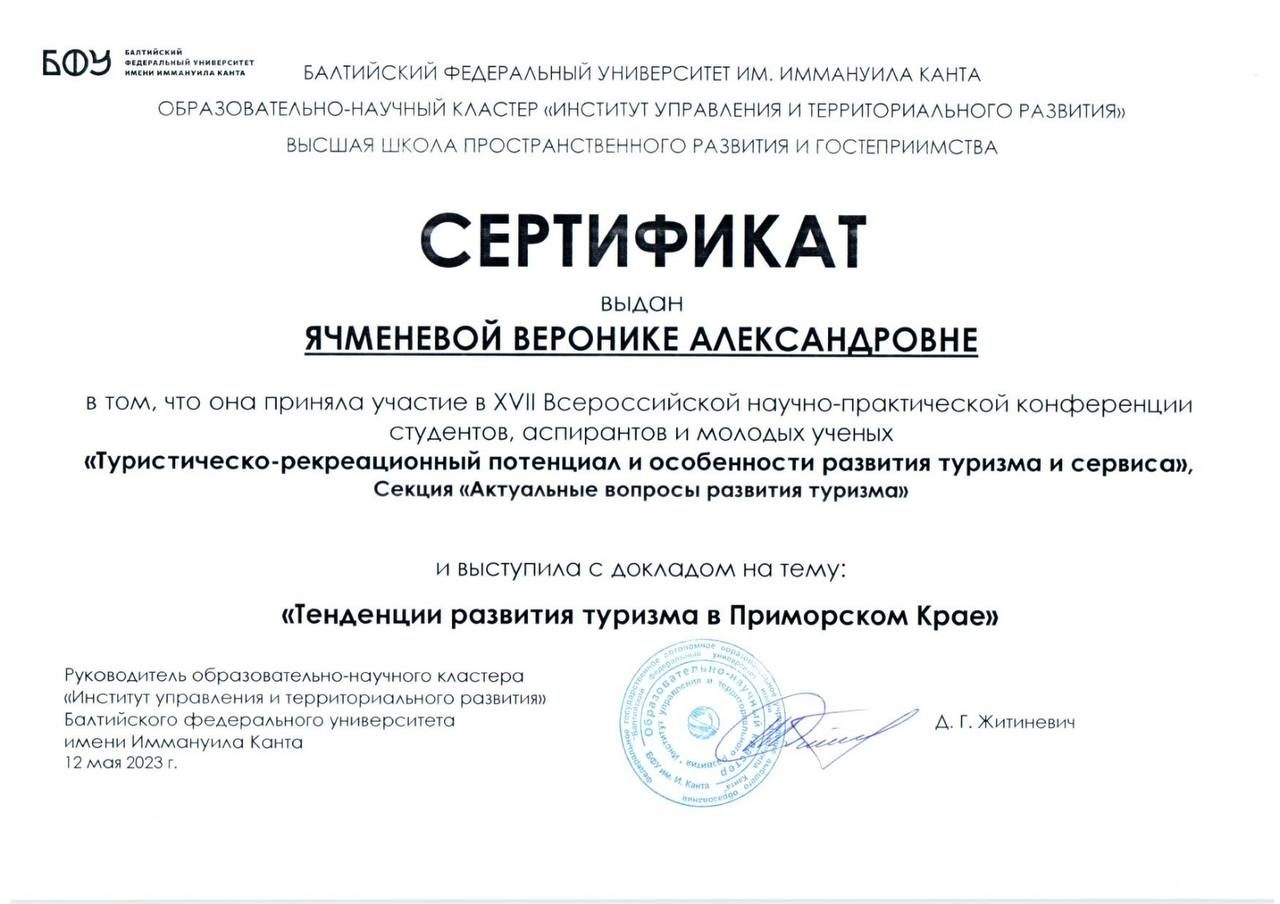 XVII Всероссийская научно-практическая конференция студентов, аспирантов и молодых ученых "Туристическо-рекреационный потенциал и особенности развития туризма и сервиса", секция "Актуальные вопросы развития туризма" | Всероссийский | 12.05.2023 - 12.05.2023 | Участник |