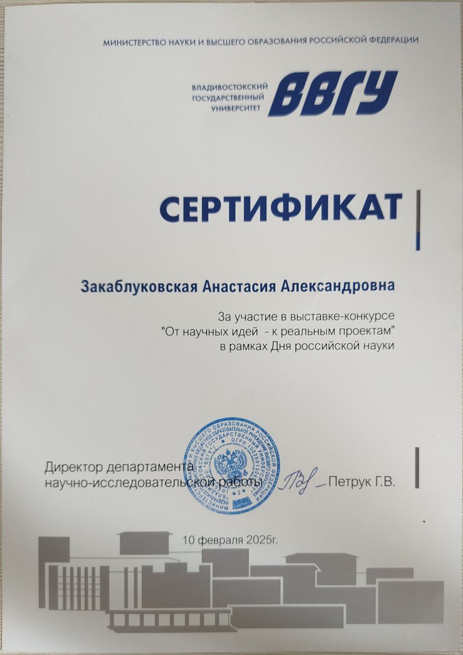 Выставка-конкурс "От научных идей - к реальным проектам" в рамках Дня российской науки в ФГБОУ ВО "ВВГУ" Внутривузовский 11.02.2025 - 11.02.2025 Участник Сертификат