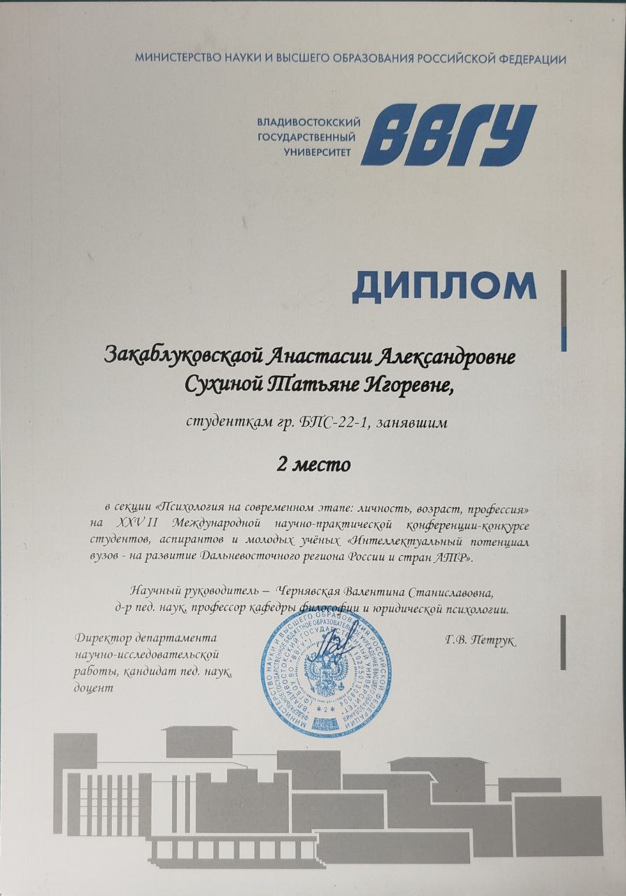 XXVII Международная научно-практическая конференция-конкурс студентов, аспирантов и молодых учёных «Интеллектуальный потенциал вузов – на развитие Дальневосточного региона России и стран Азиатско-Тихоокеанского региона» Международный 09.04.2025 - 11.09.2025 2 место Диплом