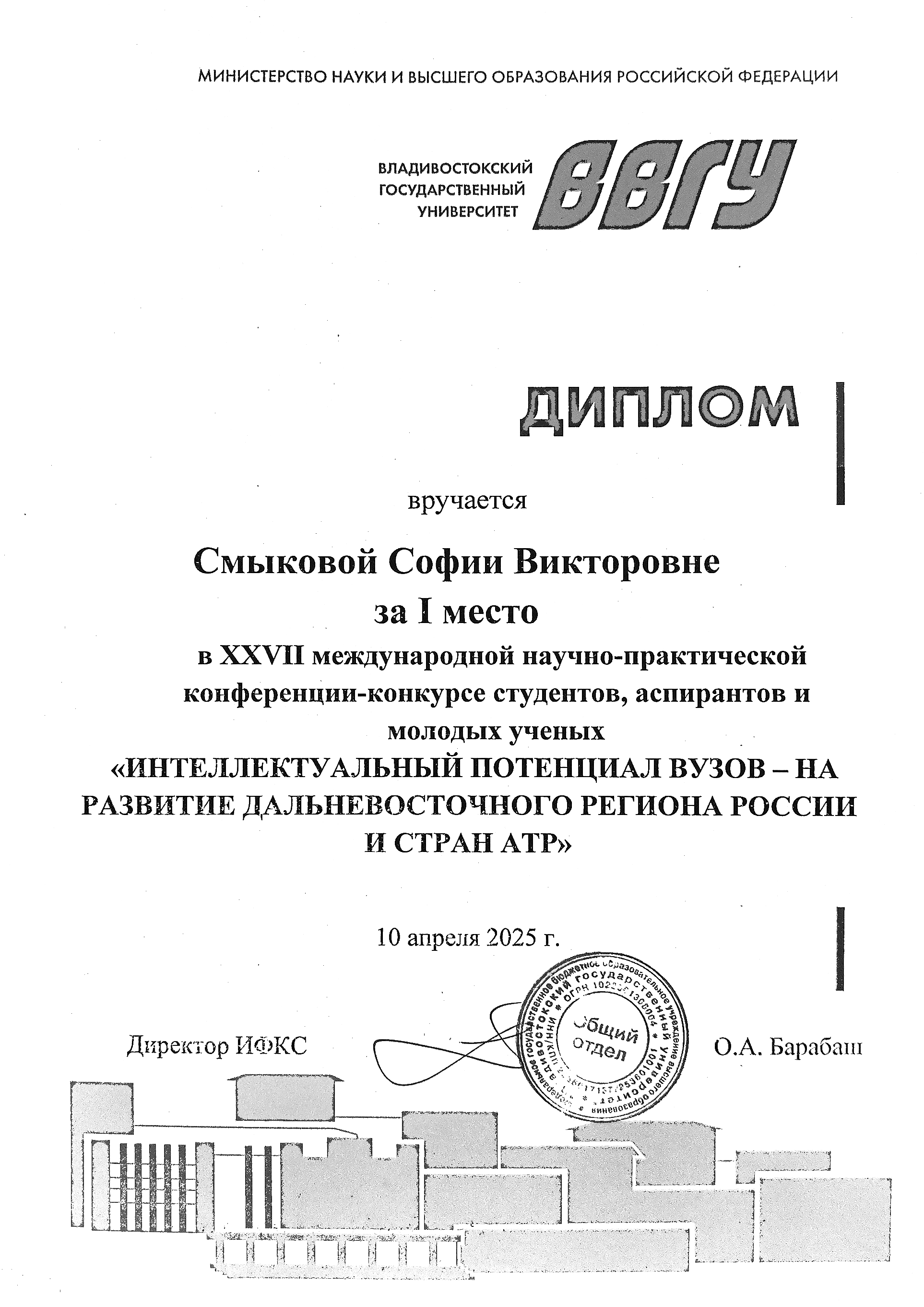 | Международная научно-практическая конференция-конкурс студентов, аспирантов и молодых учёных | Внутривузовский | 10.04.2025 | 1 место или гран-при |