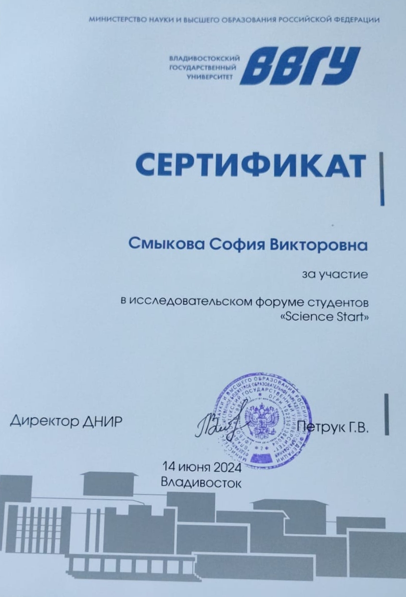 Исследовательский форум студентов "science start" | Внутривузовский | 14.06.2024 | Участник |