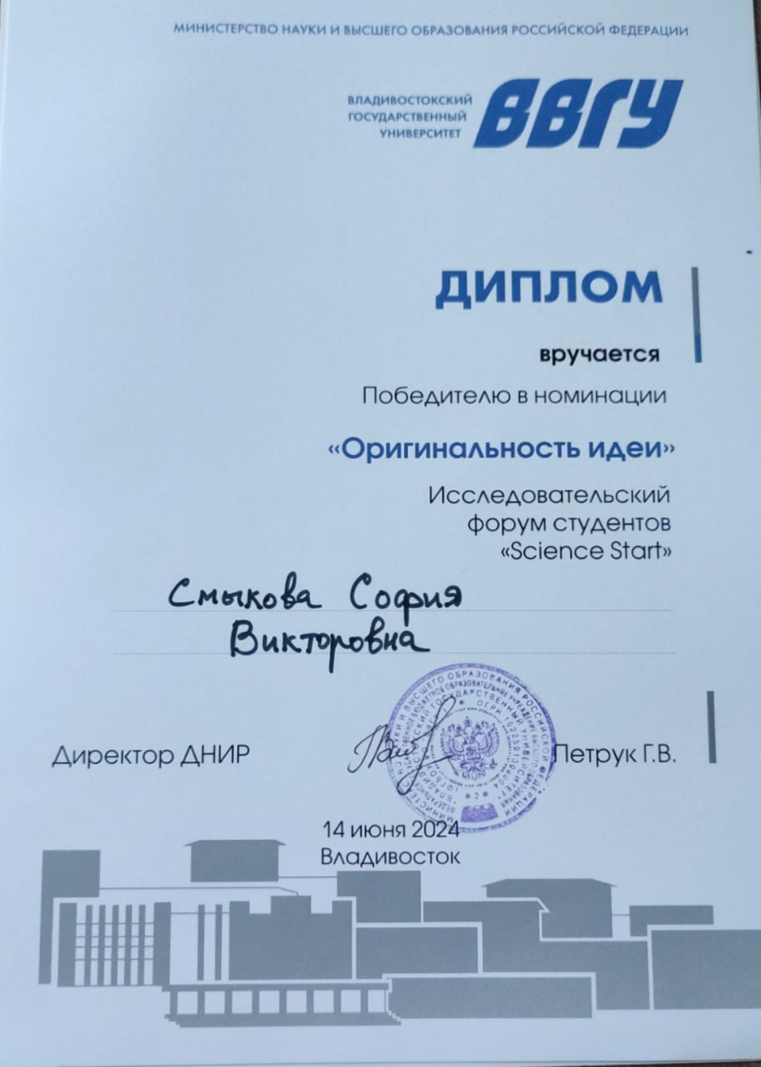 Исследовательский форум студентов "science start" | Внутривузовский | 14.06.2024 | Победитель |