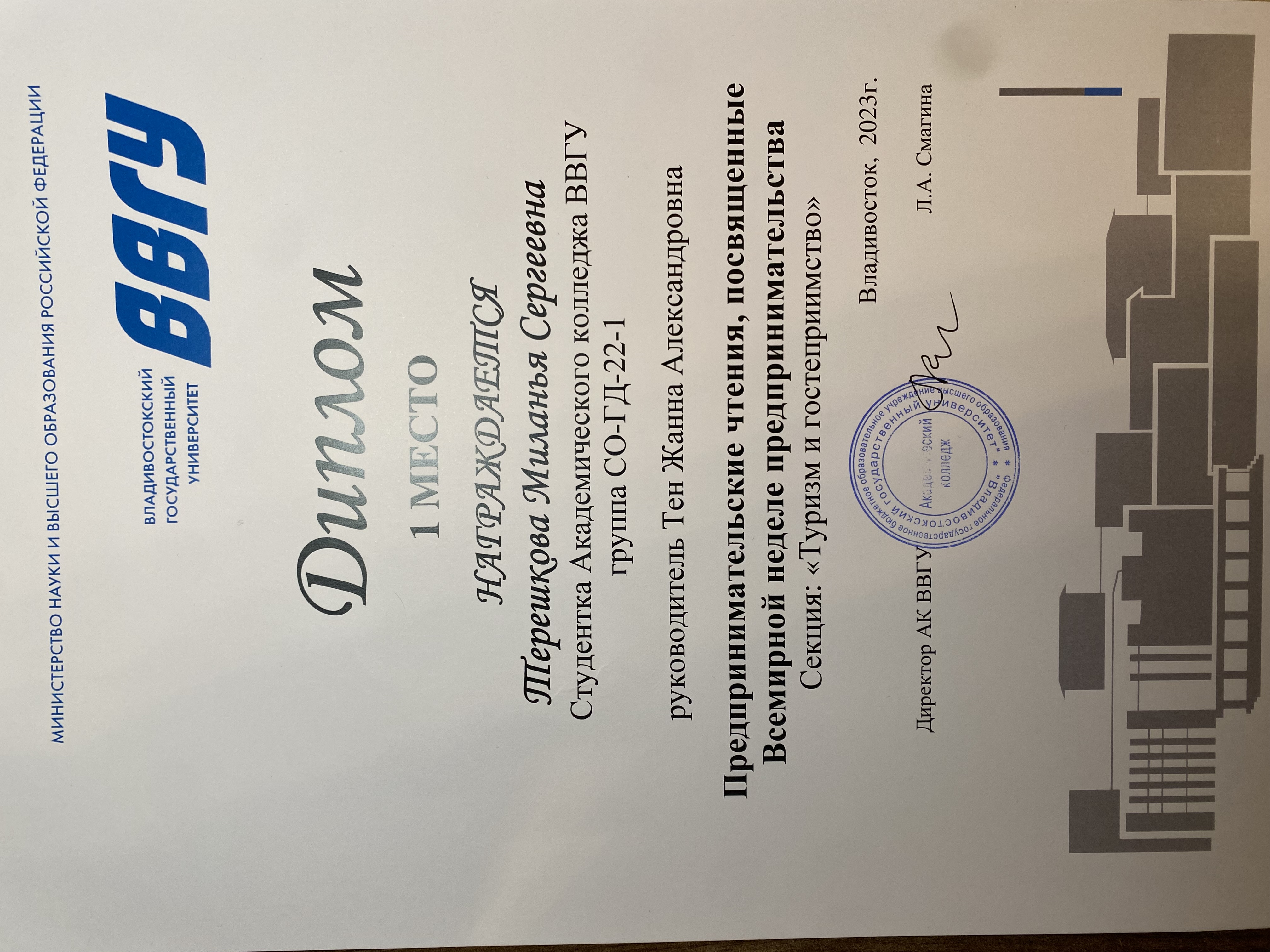 Предпринимательские чтения, посвященные Всемирной неделе предпринимательства | Конференция | Внутривузовский | 21.11.2023 - 21.11.2023 | 1 место или гран-при |