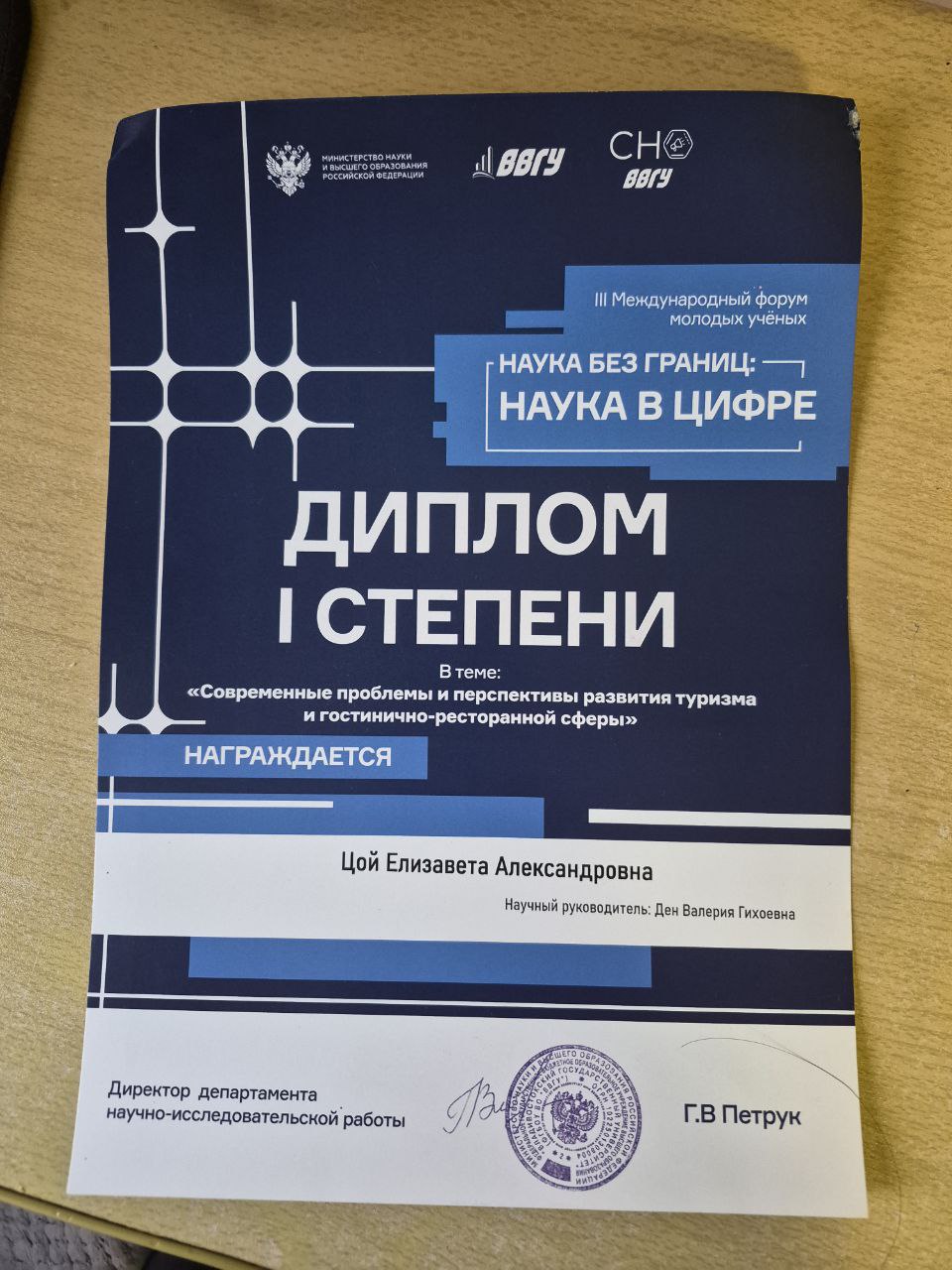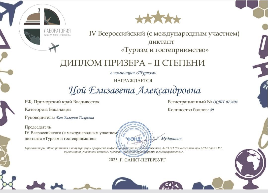 | IV Всероссийский (с международным участием) диктант "Туризм и гостеприимство" в номинации "Туризм" | Всероссийский | 27.09.2025 - 05.10.2025 | 2 место |