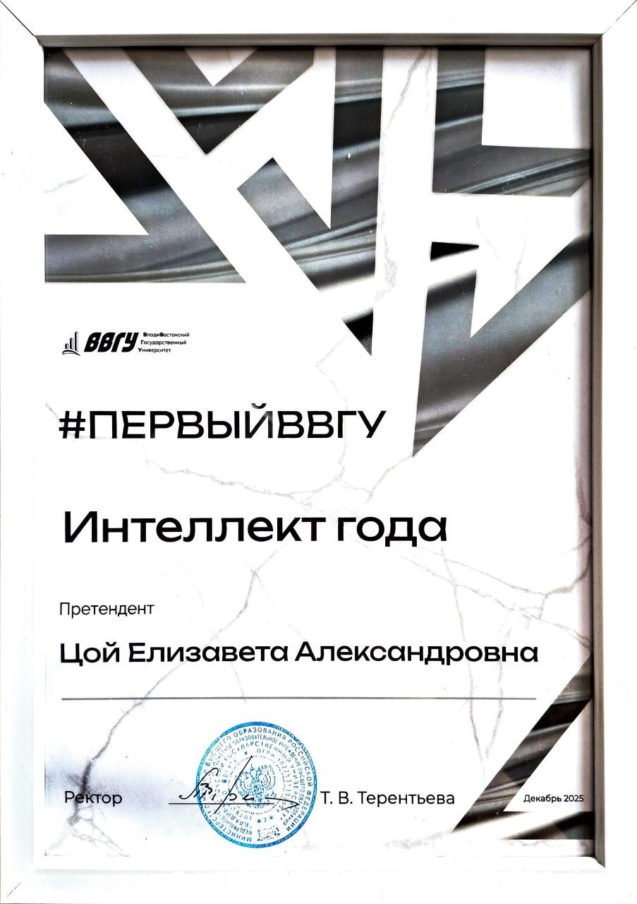 Студенческая премия "#ПЕРВЫЙВВГУ" в номинации "Интеллект года" Внутривузовский 25.12.2025 Призер Свидетельство