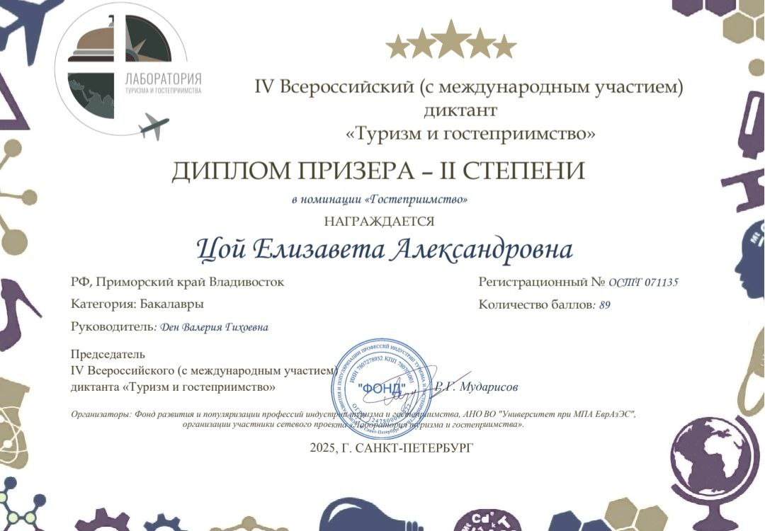 | IV Всероссийский (с международным участием) диктант "Туризм и гостеприимство" в номинации "Гостеприимство" | Всероссийский | 27.09.2025 - 05.10.2025 | 2 место |