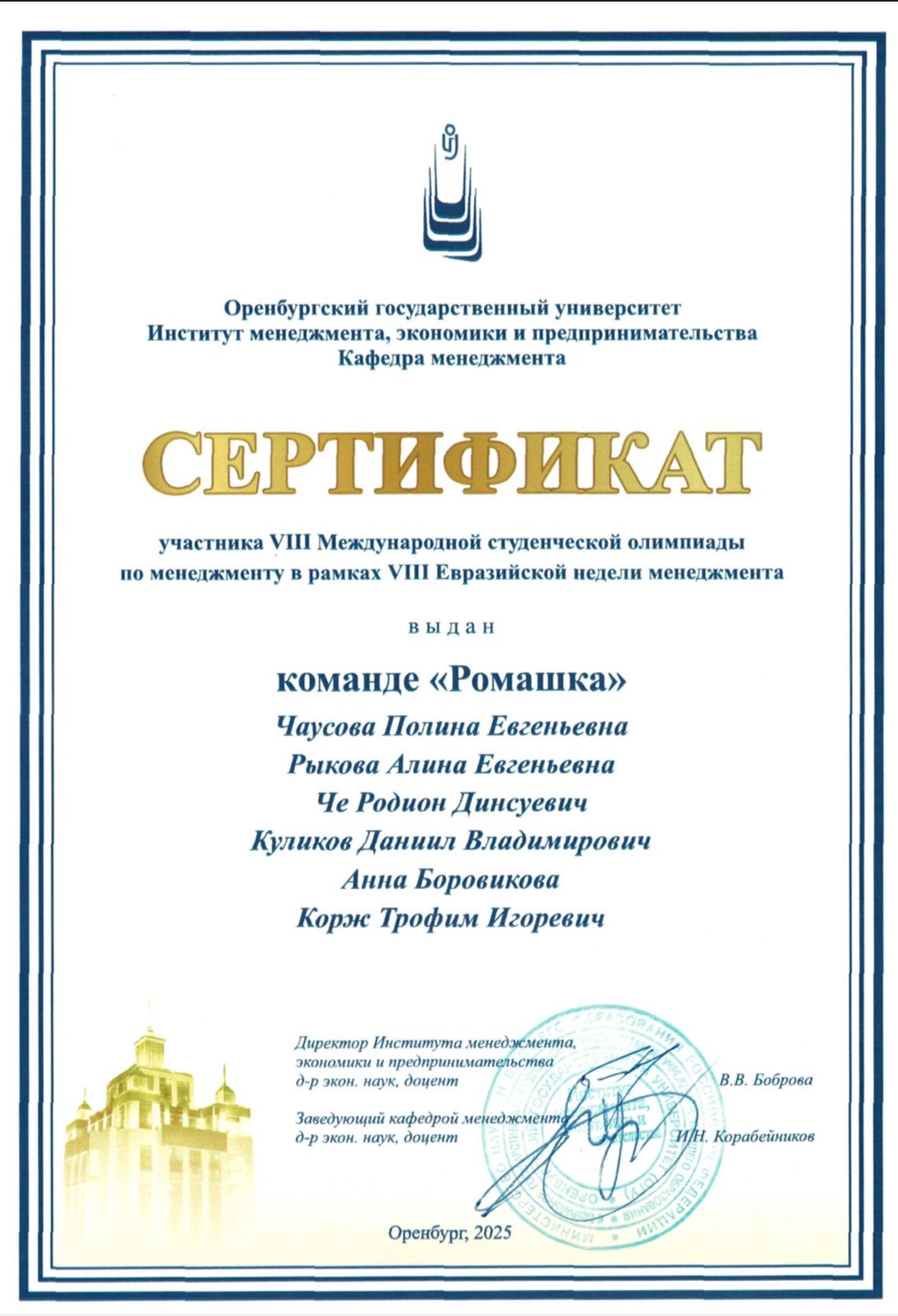 VIII Международная студенческая олимпиада по менеджменту | Олимпиада | Международный | 11.10.2024 - 30.10.2024 | Участник |