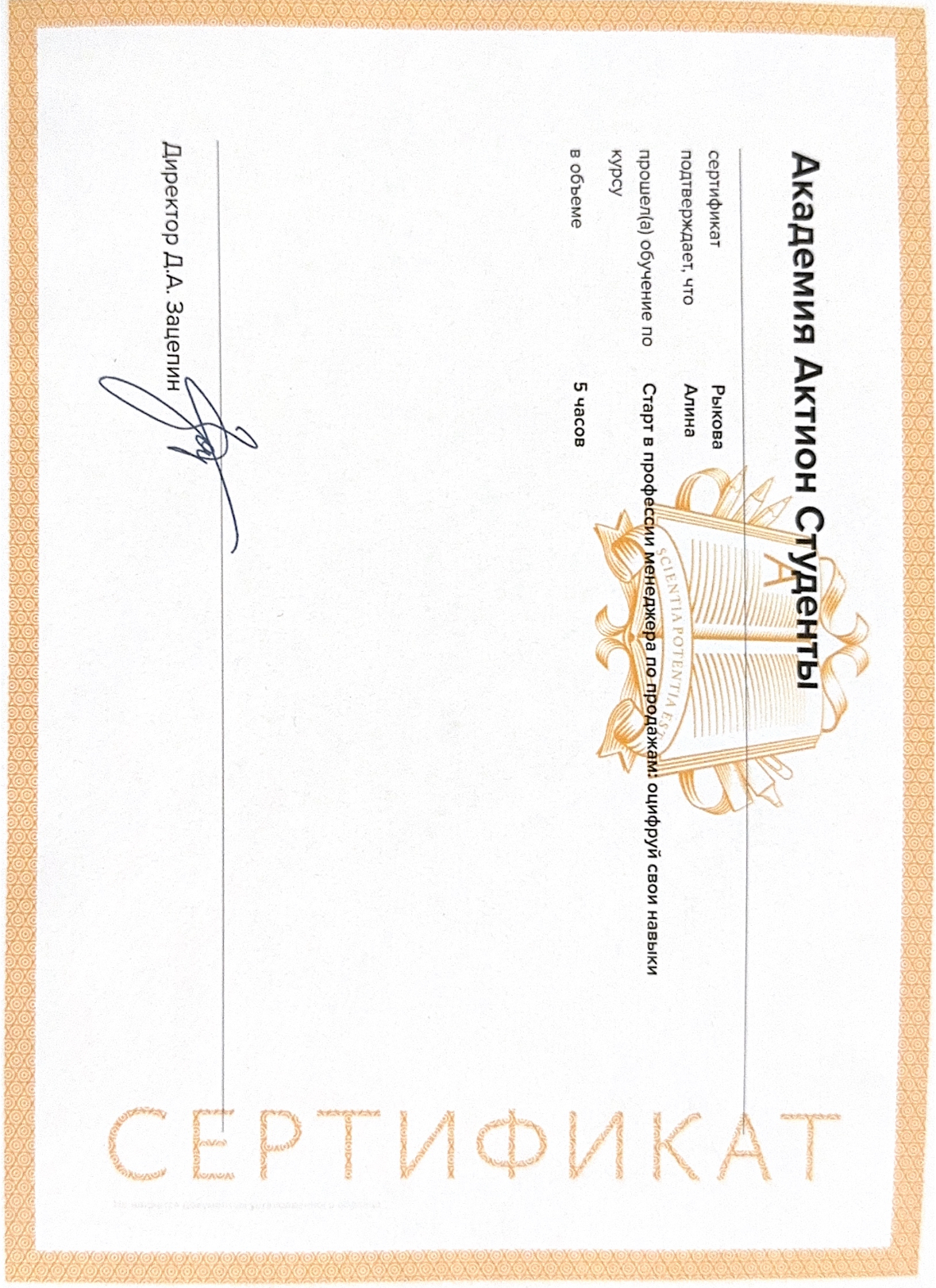 Старт в профессии менеджера по продажам: оцифруй свои навыки | Обучение | Всероссийский | 08.01.2025 - 13.01.2025 | Сертификат |
