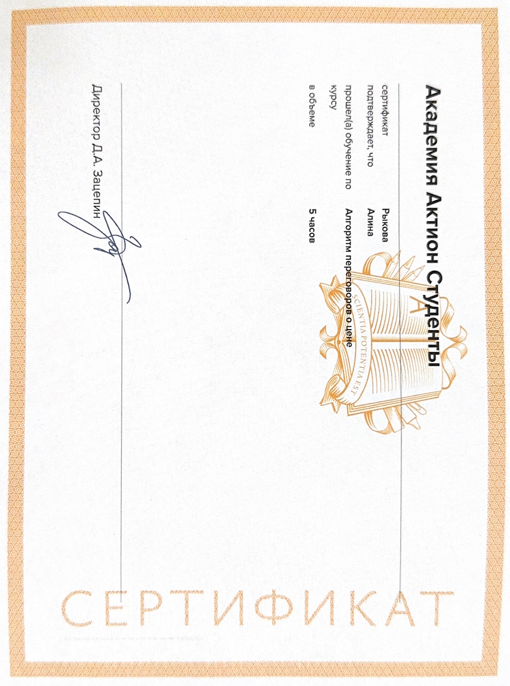 Алгоритм переговоров о цене | Обучение | Всероссийский | 06.01.2025 - 13.01.2025 | Сертификат |