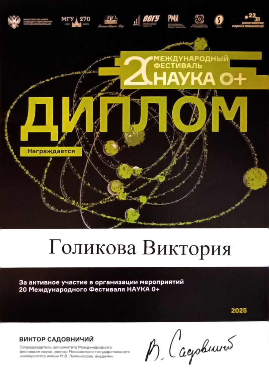 Участие в организации мероприятий 20 международного фестиваля "Наука 0+" Фестиваль Международный 11.10.2025 - 11.10.2025 Участник Диплом