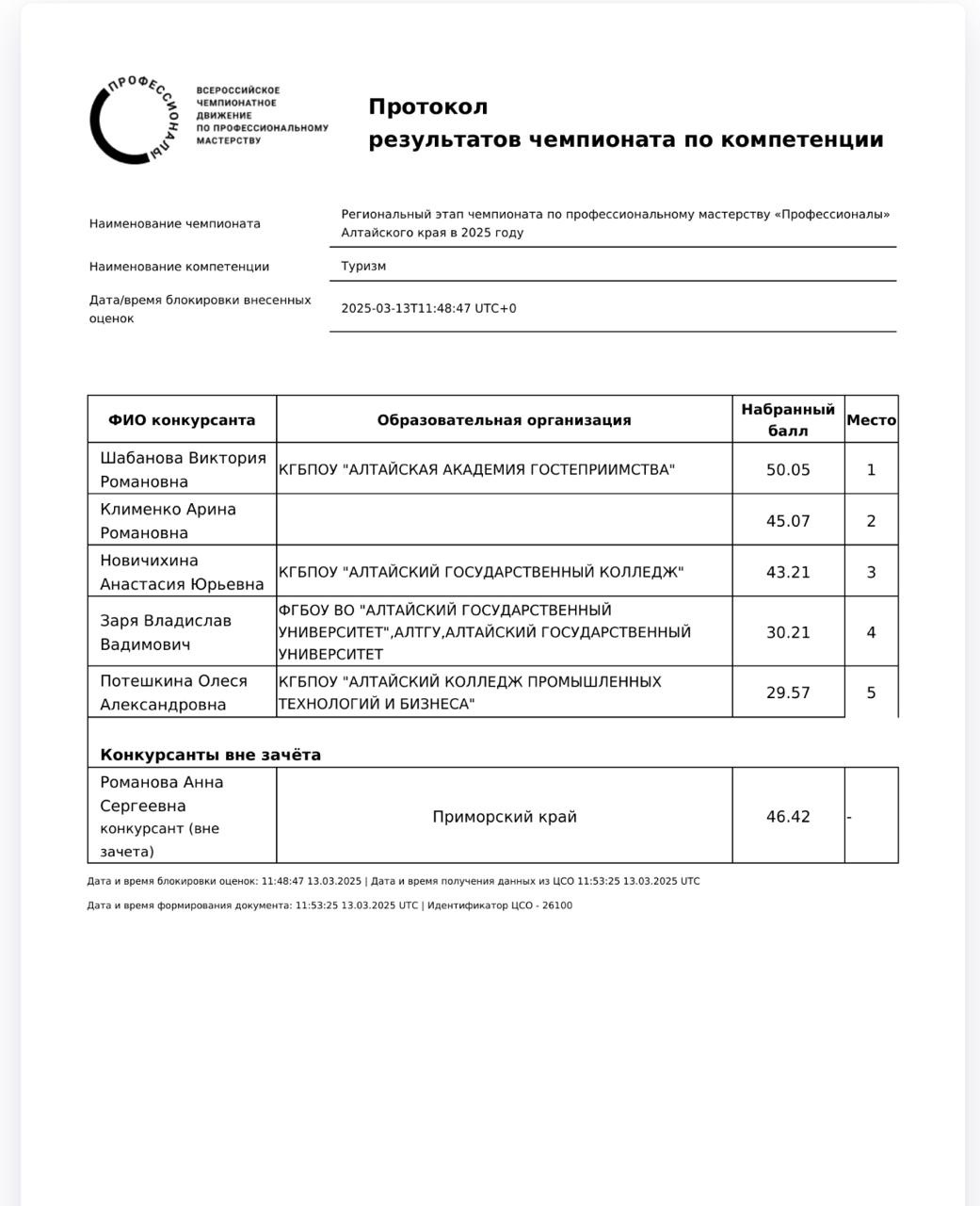 Сертификат, протокол результатов чемпионата