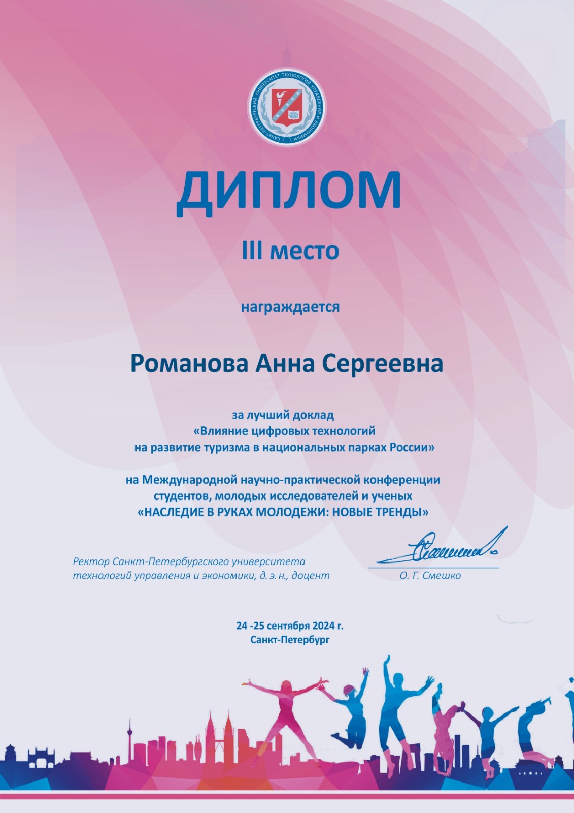 Международная научно-практическая конференция студентов и молодых учёных "Наследие в руках молодёжи: новые тренды" | Конкурс | Международный | 24.09.2024 - 25.09.2024 | 3 место |