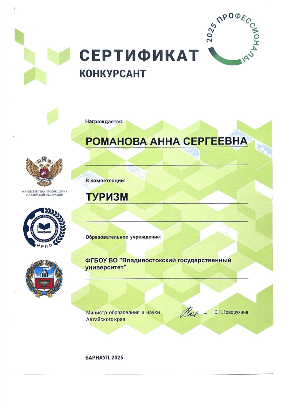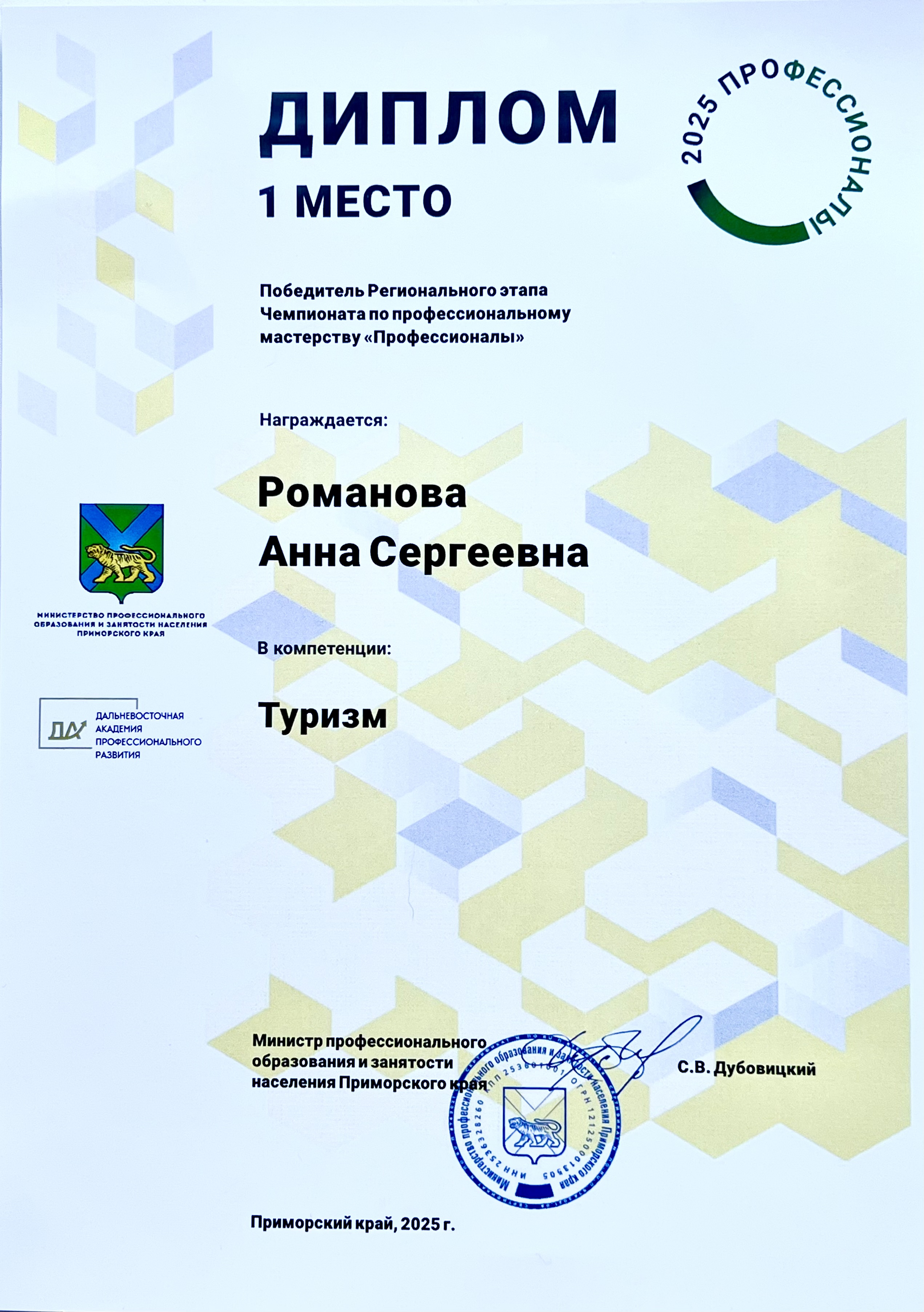 Чемпионат по профессиональному мастерству «Профессионалы» | Чемпионат | Региональный | 10.02.2025 - 16.02.2025 | 1 место или гран-при |