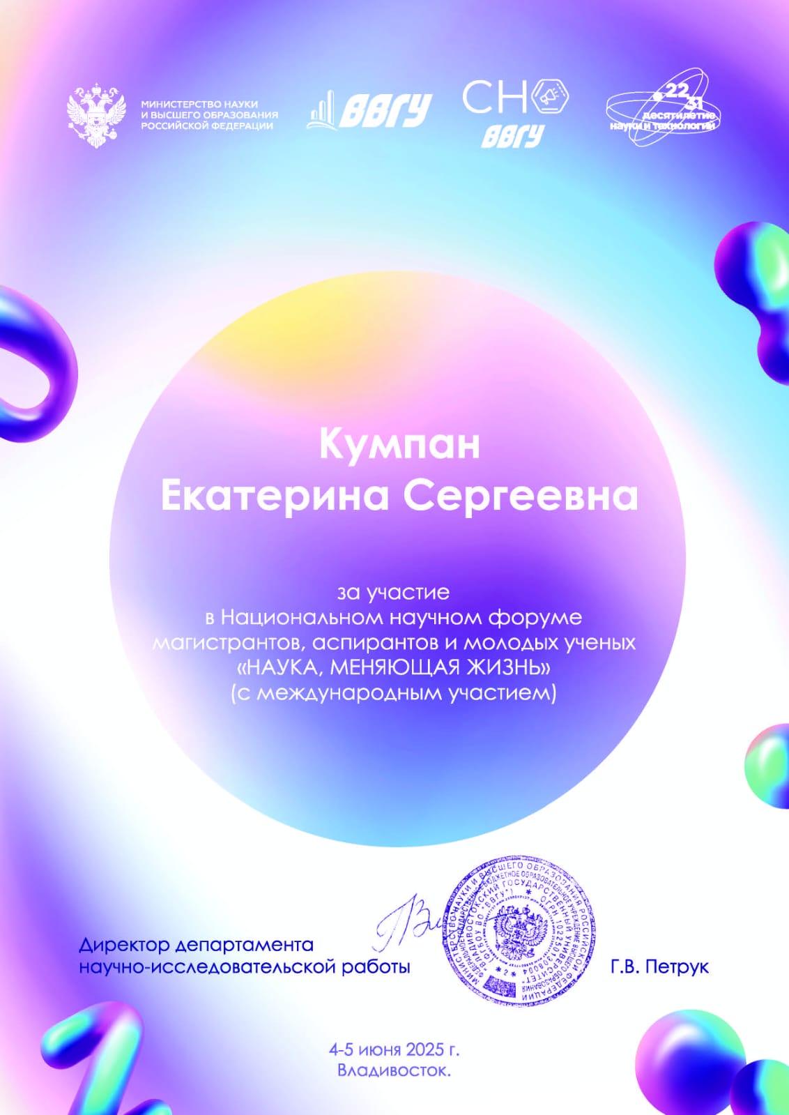 | Национальный научный форум магистрантов, аспирантов и молодых ученых «НАУКА, МЕНЯЮЩАЯ ЖИЗНЬ» (с международным участием) | Международный | 04.06.2025 - 05.06.2025 | Участник |