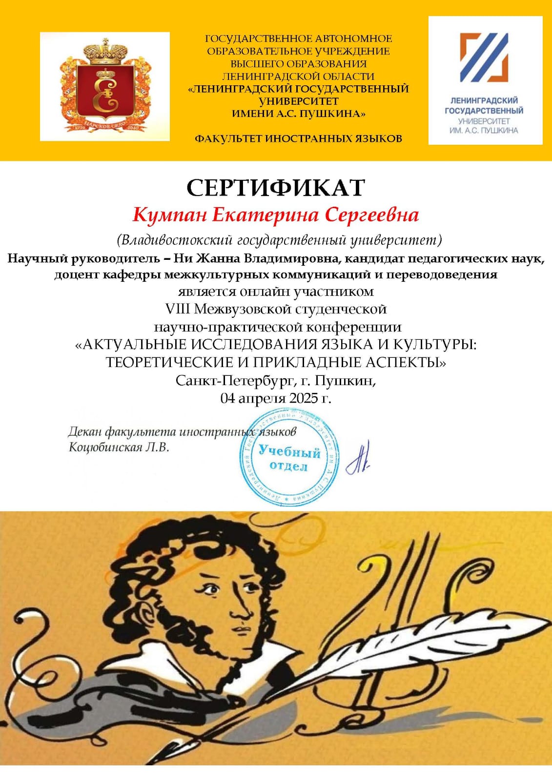 | VIII Межвузовская студенческая научно-практическая конференция «АКТУАЛЬНЫЕ ИССЛЕДОВАНИЯ ЯЗЫКА И КУЛЬТУРЫ: ТЕОРЕТИЧЕСКИЕ И ПРИКЛАДНЫЕ АСПЕКТЫ» Санкт-Петербург, г. Пушкин, | Всероссийский | 04.04.2025 - 04.04.2025 | Участник |