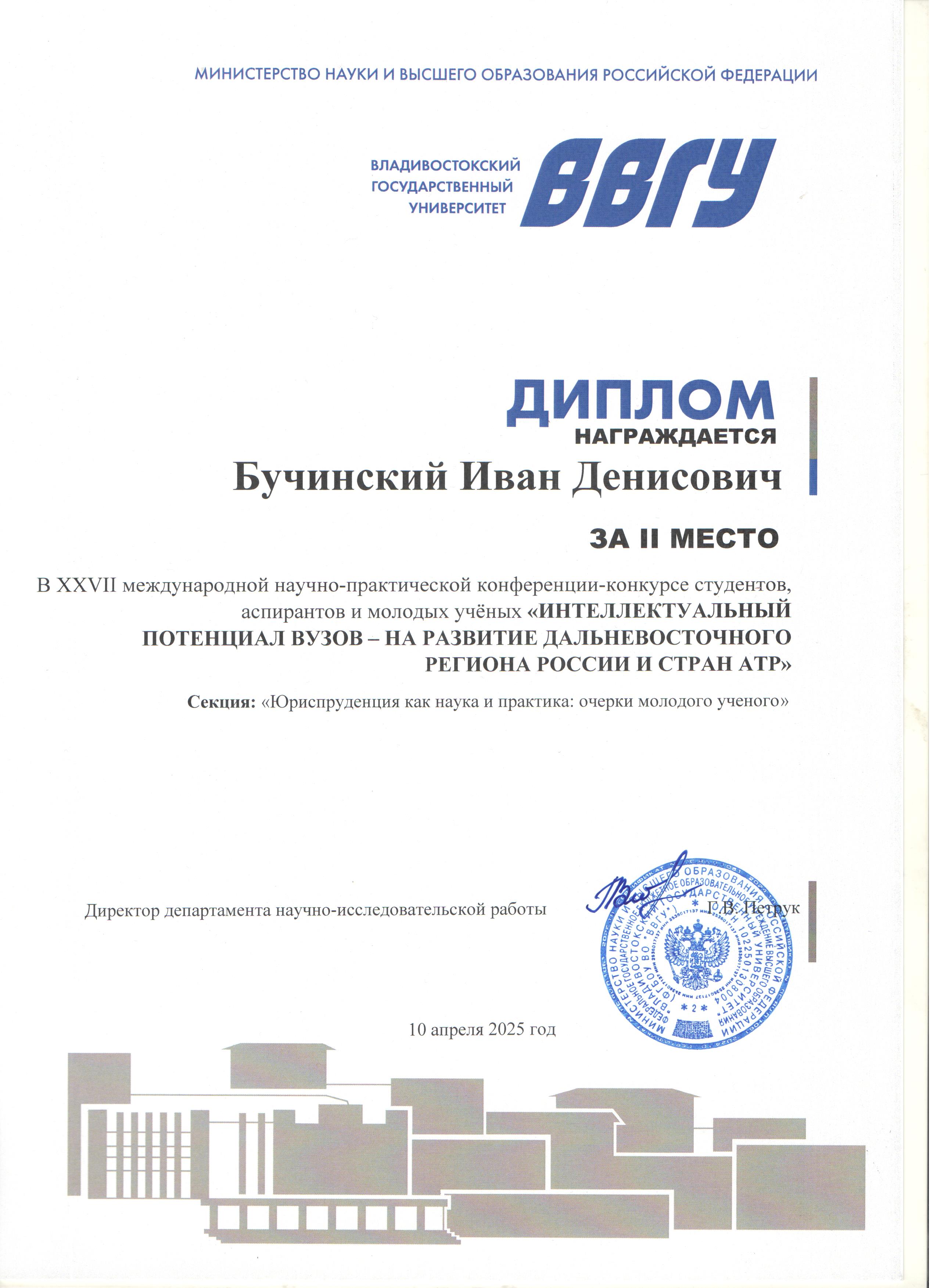 XXVII международная научно-практическая конференция-конкурс "Интеллектуальный потенциал вузов - на развитие Дальневосточного региона России и стран АТР" | Международный | 09.04.2025 - 11.04.2025 | 2 место |