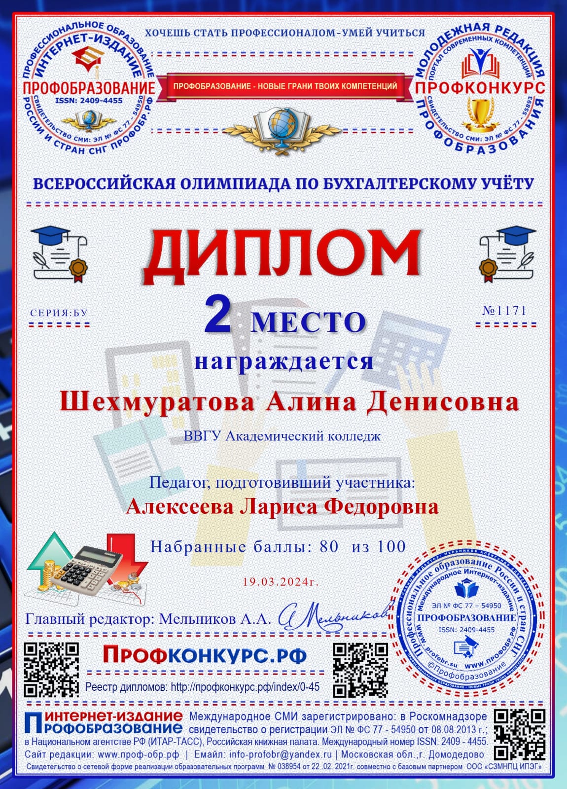Всероссийская олимпиада по бухгалтерскому учету Всероссийский 19.03.2024 2 место Диплом