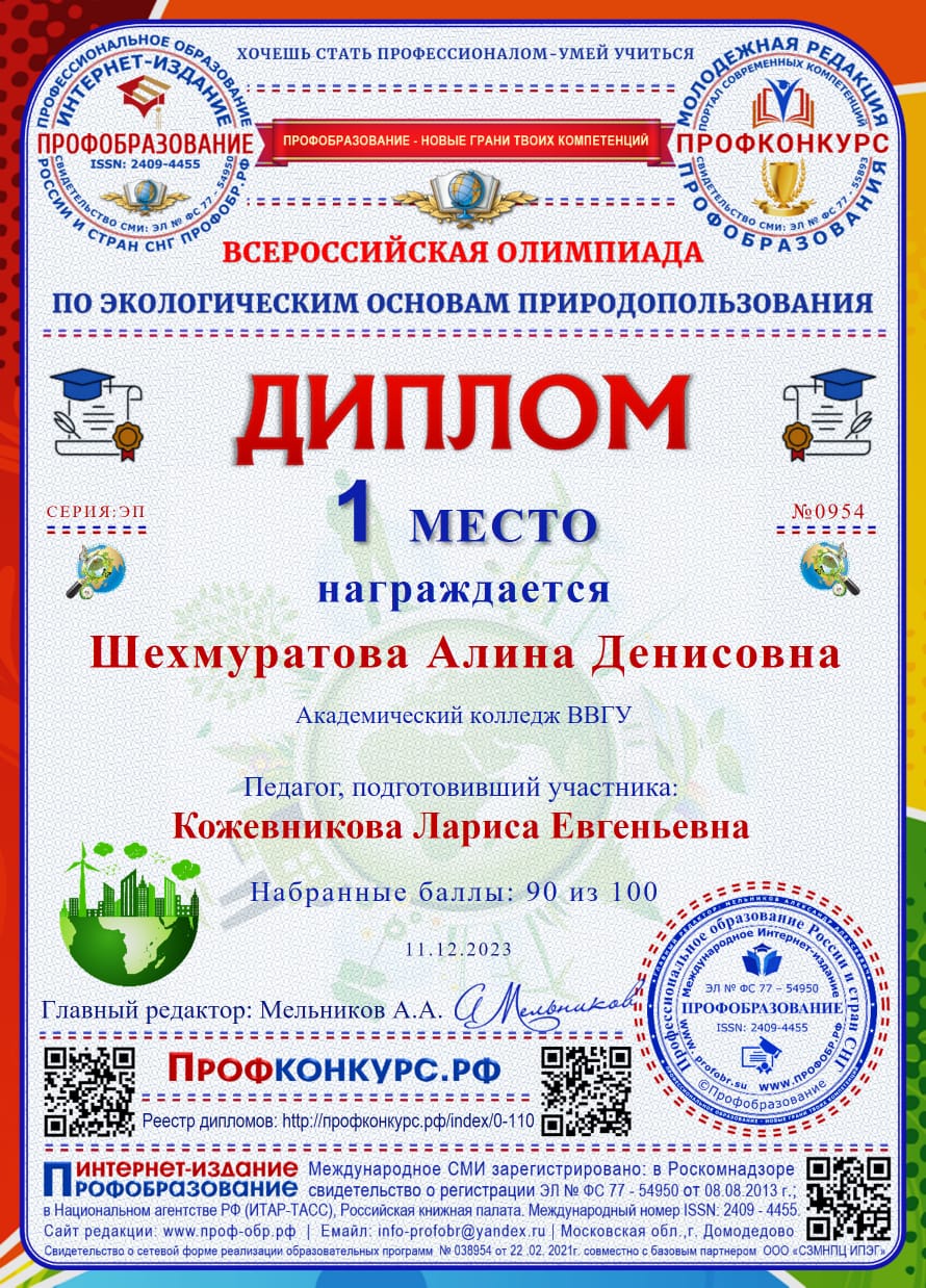 Всероссийская олимпиада по экологическим основам природопользования Всероссийский 11.12.2023 1 место или гран-при Диплом