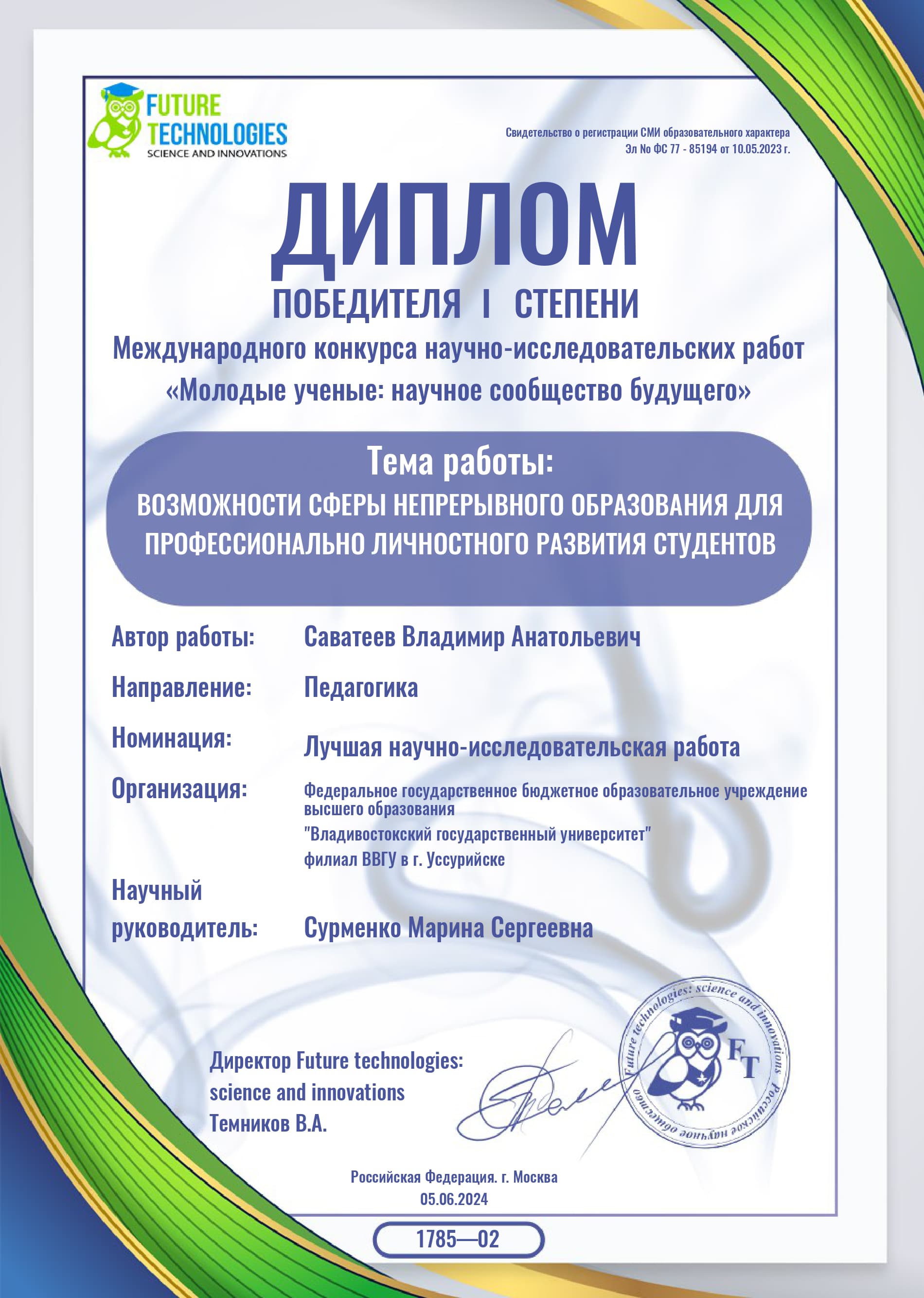 Международный конкурс научно – исследовательских работ «Форсайт науки - 2024» | Международный | 17.06.2024 - 17.06.2024 | 1 место или гран-при |