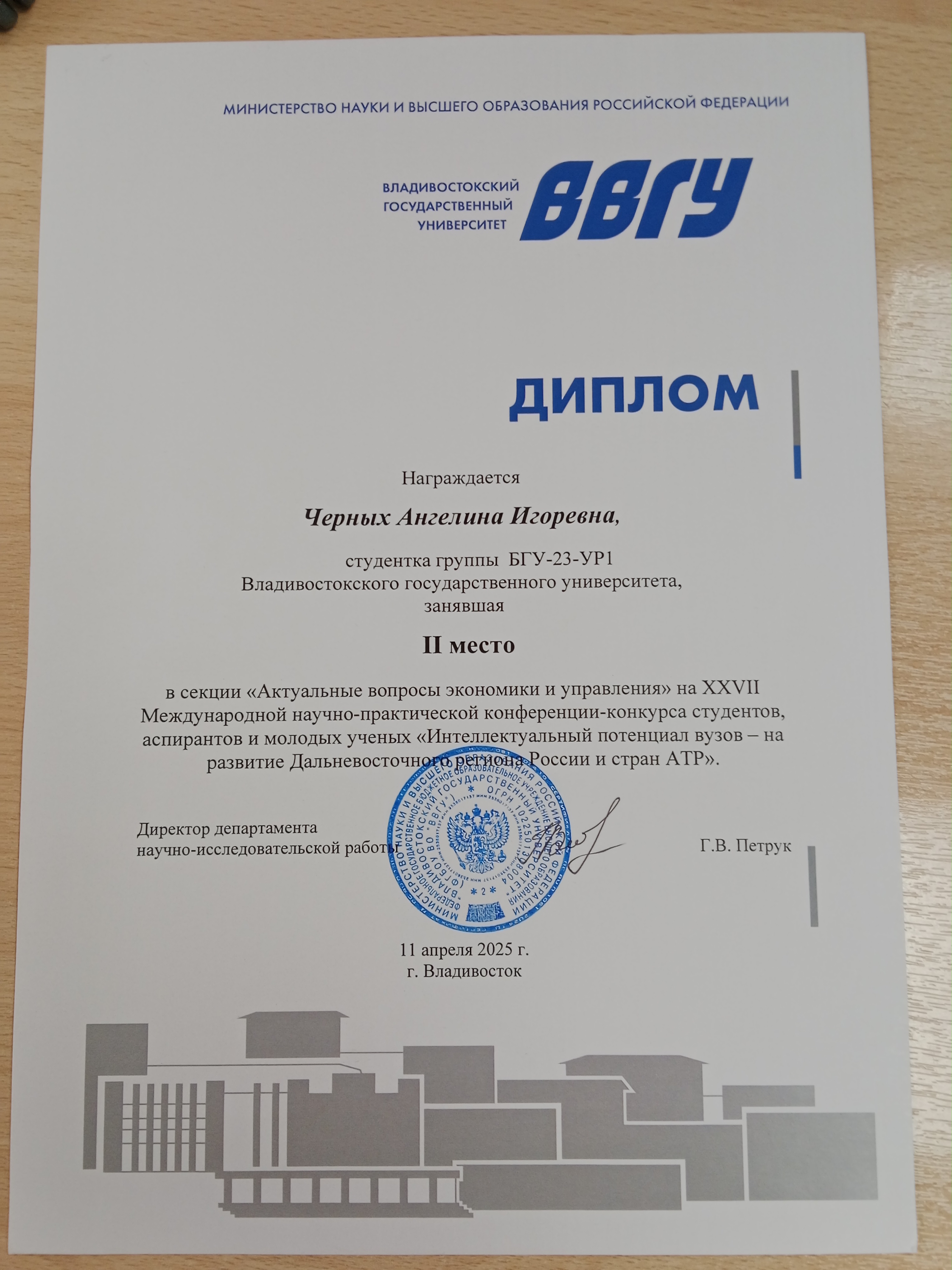 Международная научнопрактическая конференция-конкурс студентов, аспирантов и молодых учёных "Интеллектуальный потенциал вузов-на развитие Дальневосточного региона России и стран АТР" Международный 09.04.2025 - 11.06.2025 2 место Диплом