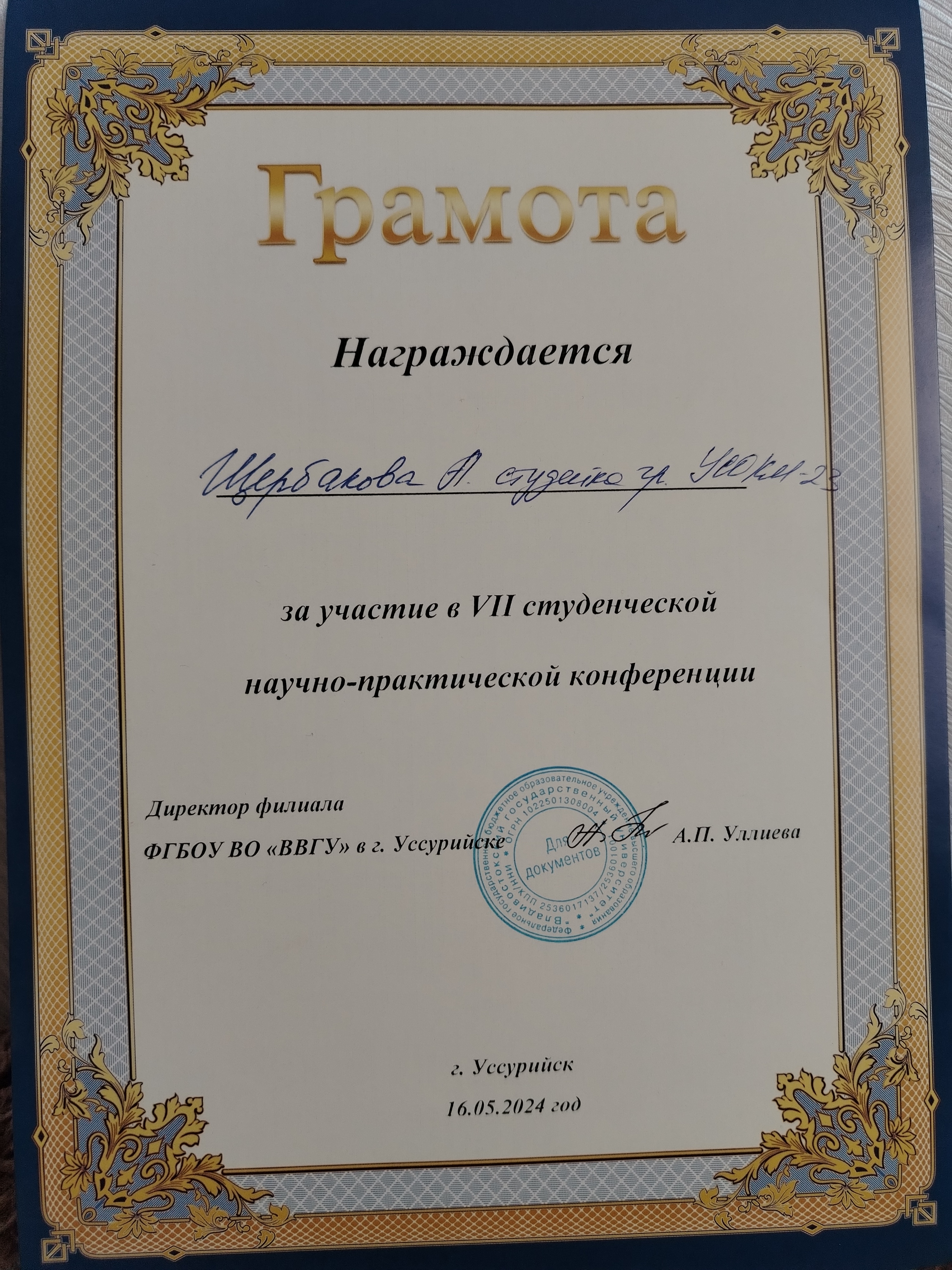 Студенческая научно-практическая конфиренция | Внутривузовский | 16.05.2024 |