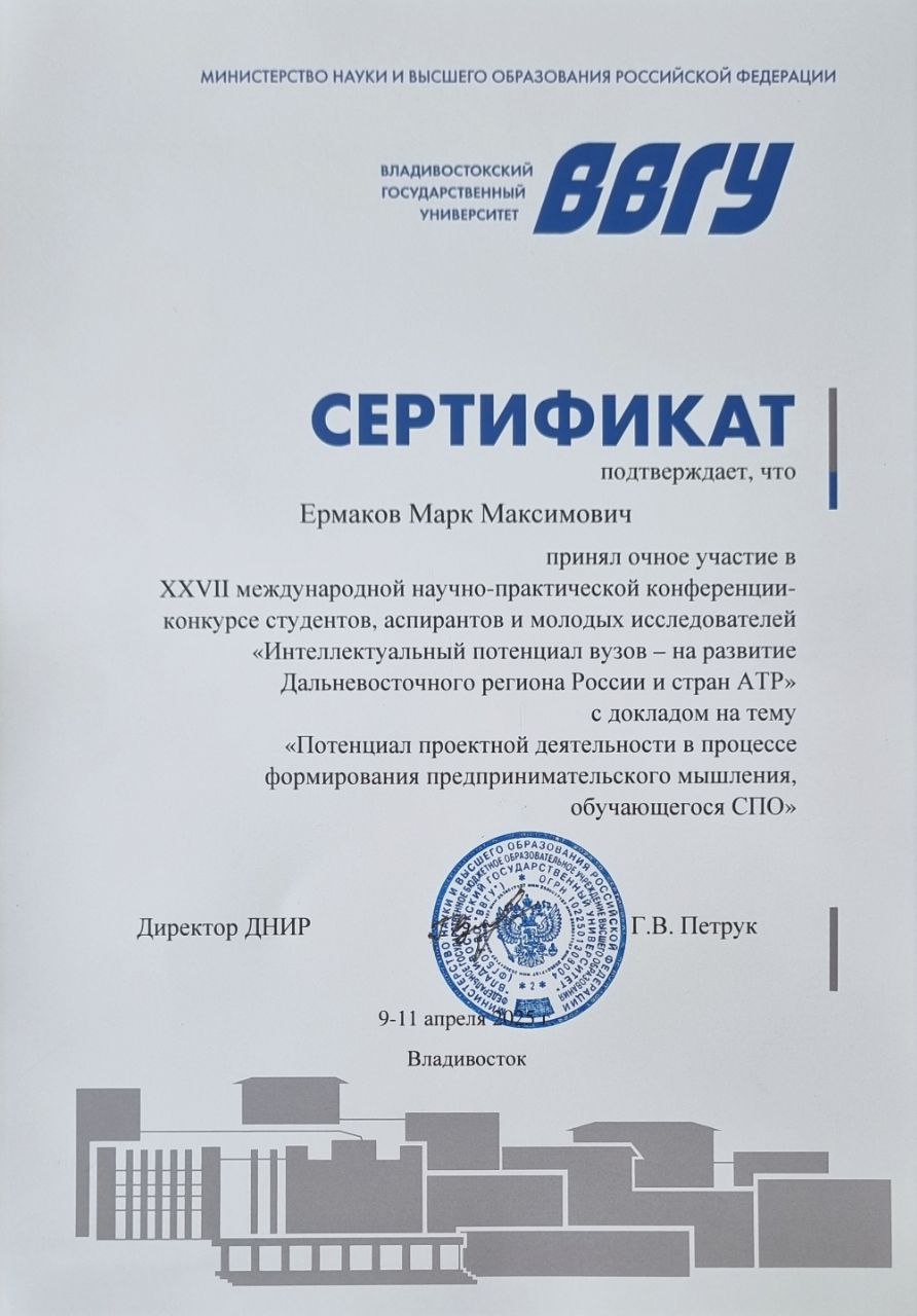 XXVII международная научно-практическая конференция-конкурс студентов, аспирантов и молодых исследователей "Интеллектуальный потенциал вузов - на развитие Дальневосточного региона России и стран АТР" - | Конференция | Международный | 09.04.2025 - 11.04.2025 | Участник |