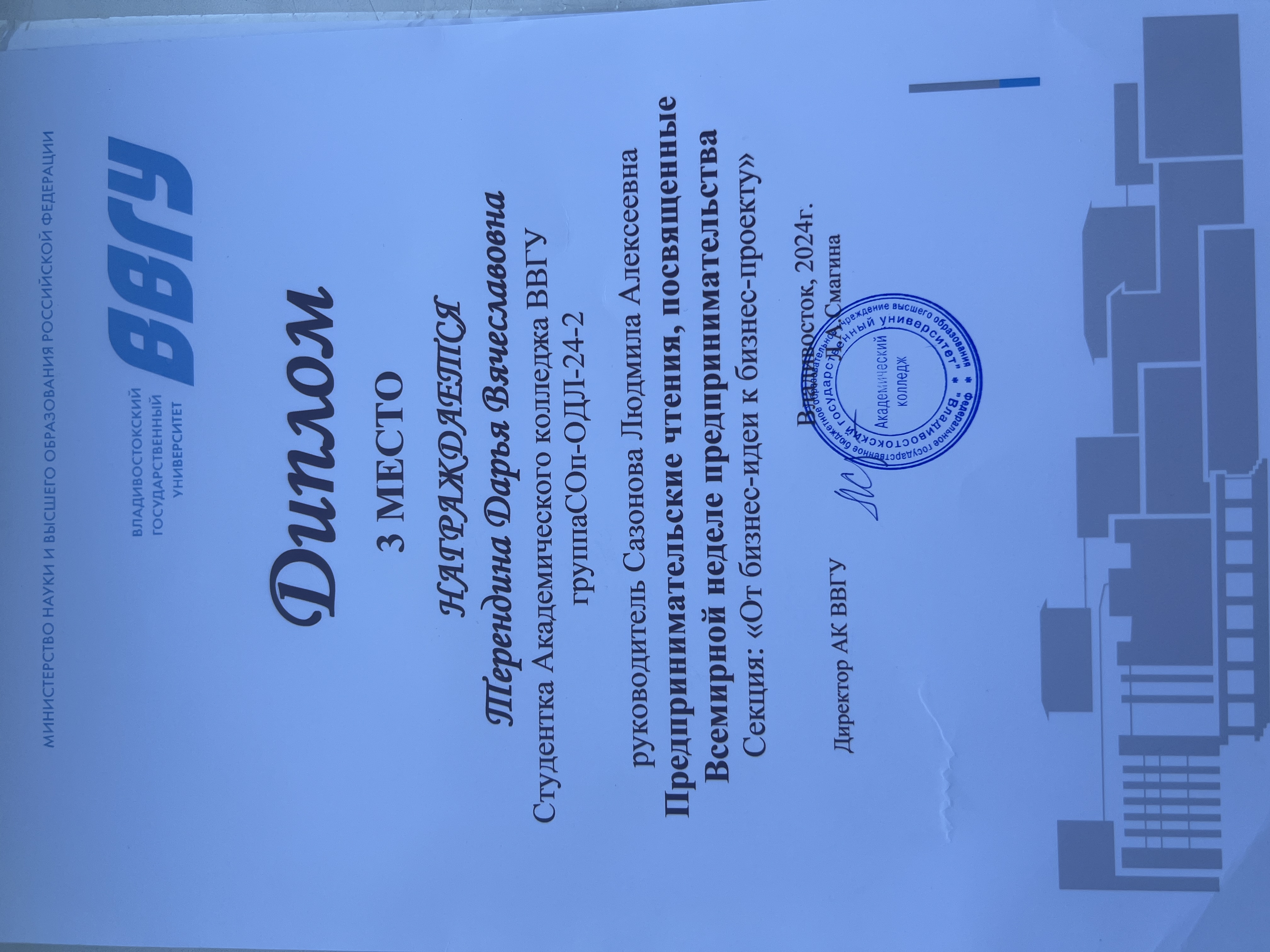 Предпринемательские чтения , посвященные Всемирной неделе предпринимательства Предпринимательские чтения Внутривузовский 25.11.2024 - 26.11.2024 3 место Диплом