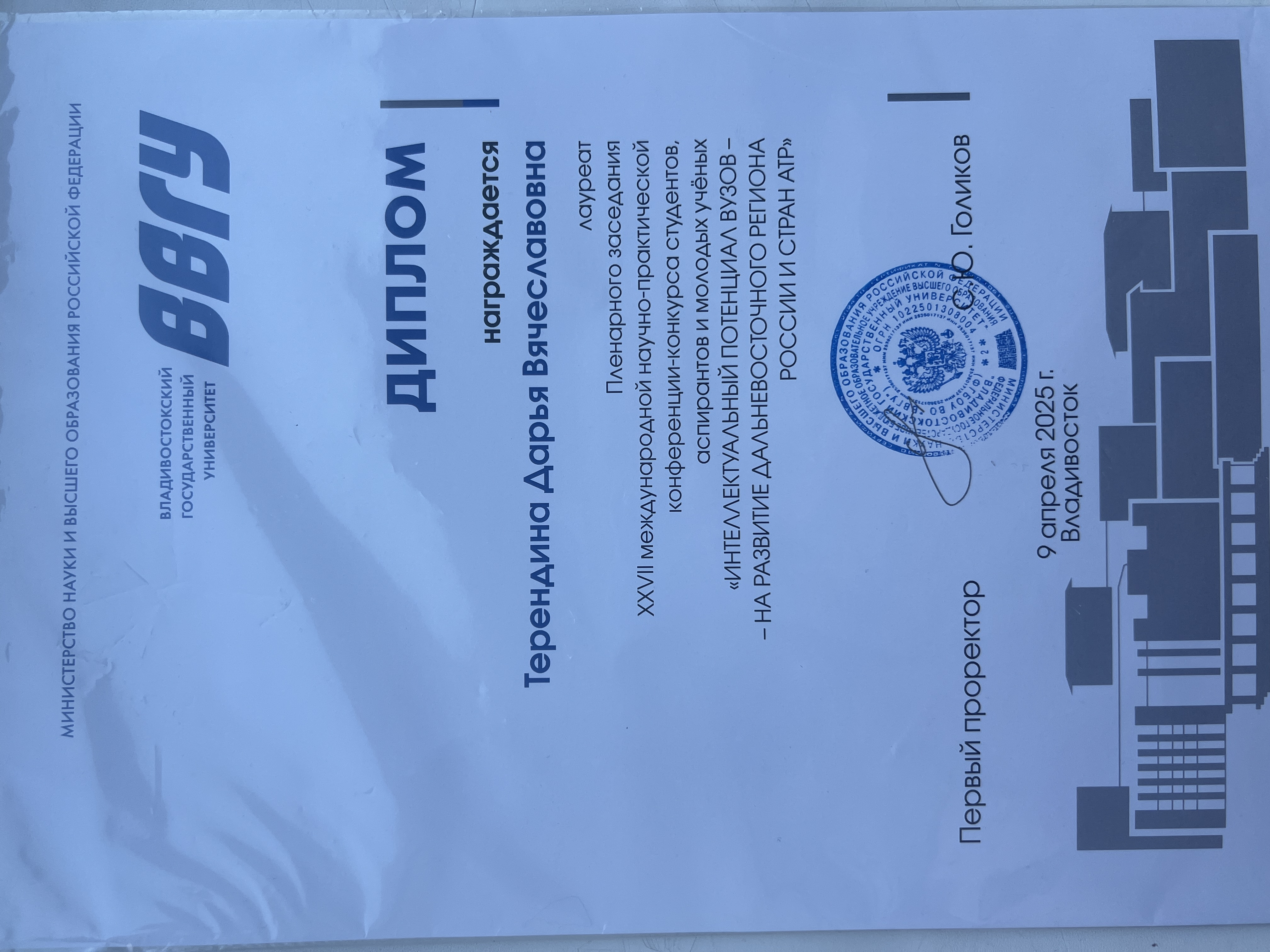 XXVI международная научно-практическая конференция-конкурс студентов, аспирантов и молодых учёных ИНТЕЛЛЕКТУАЛЬНЫЙ ПОТЕНЦИАЛ ВУЗОВ - НА РАЗВИТИЕ ДАЛЬНЕВОСТОЧНОГО РЕГИОНА РОССИИ И СТРАН АЗИАТСКО-ТИХООКЕАНСКОГО РЕГИОНА Научная Конференция Международный 09.04.2025 - 11.06.2025 Диплом Диплом