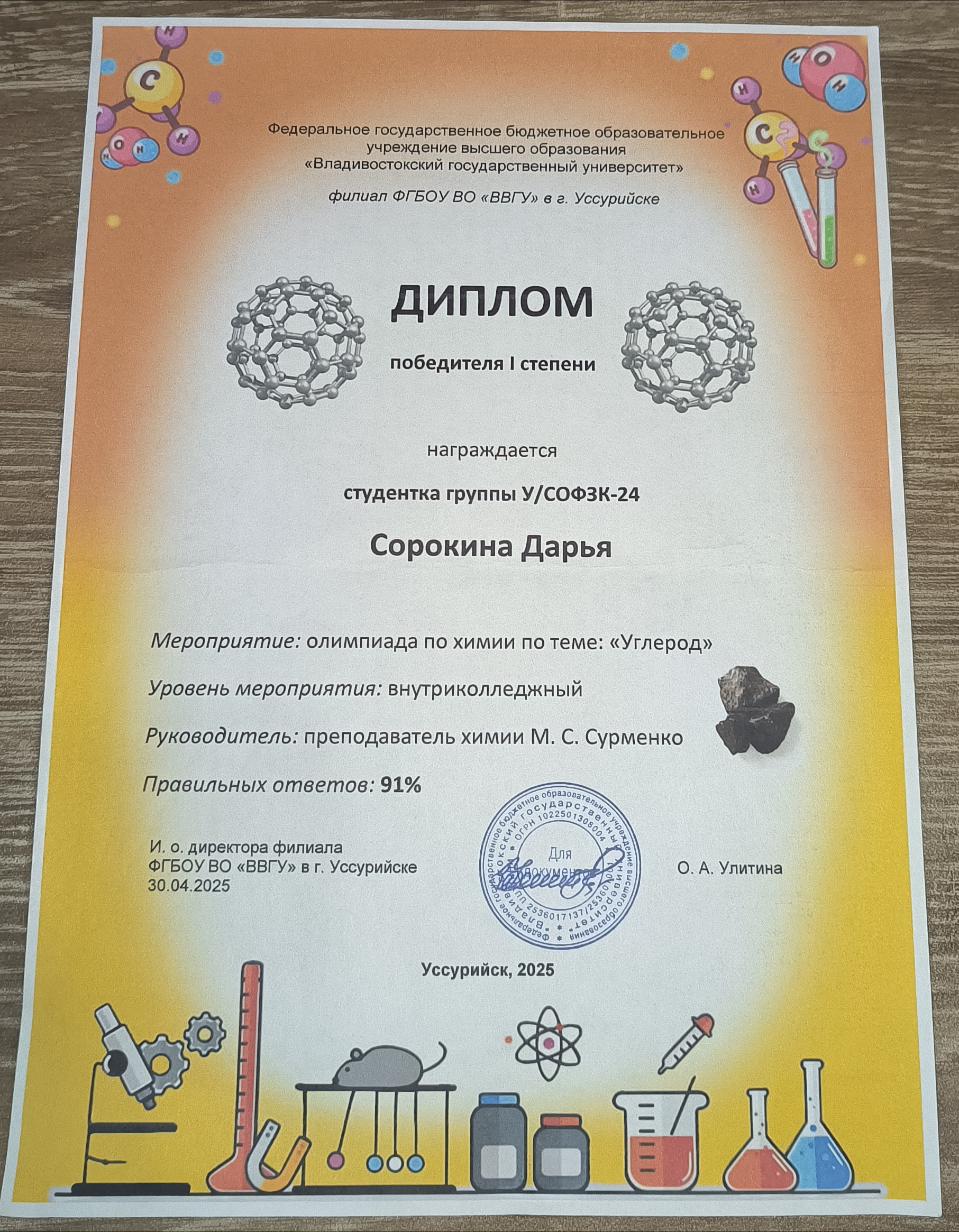 Олимпиада по химии по теме «Углерод» | Внутривузовский | 30.04.2025 | 1 место или гран-при |